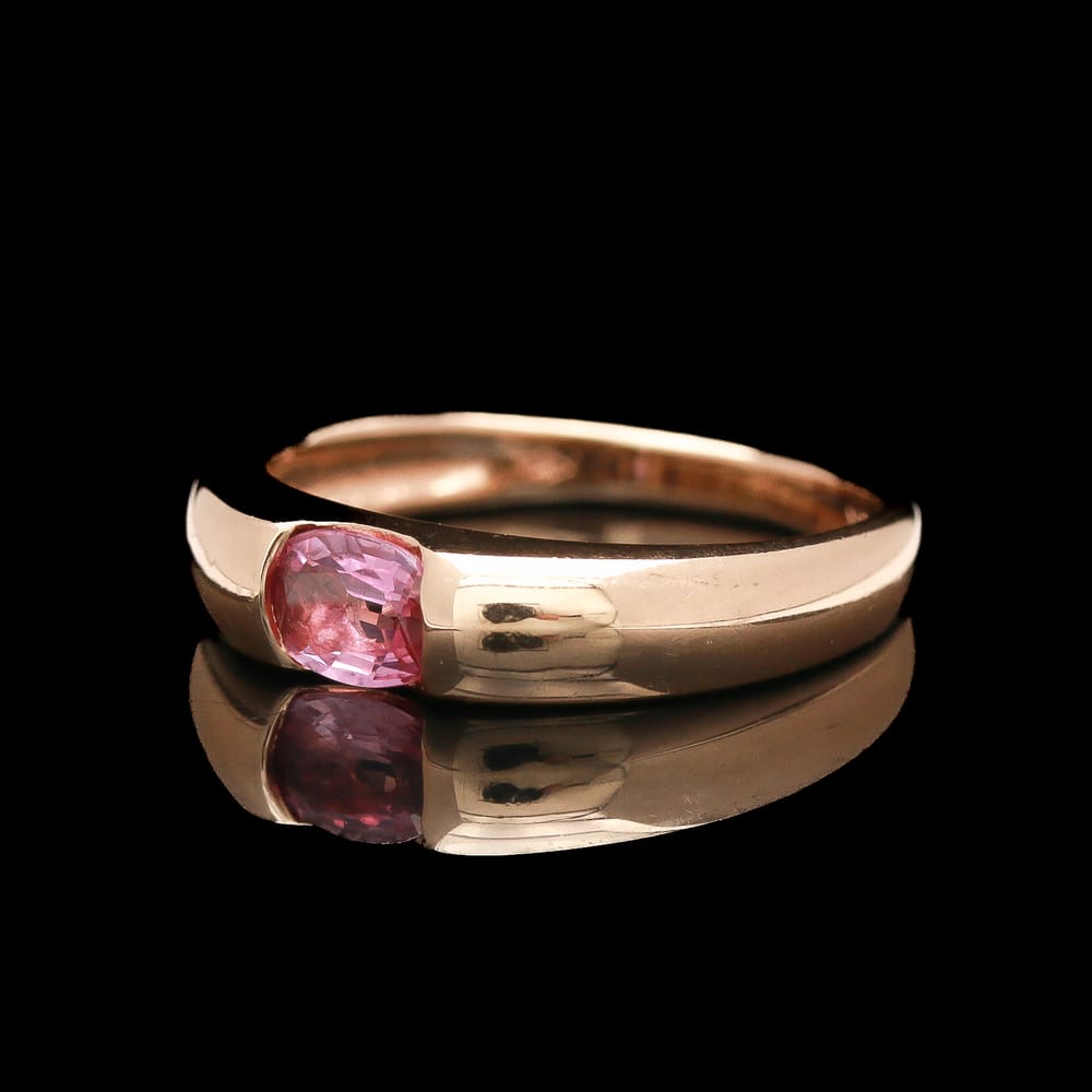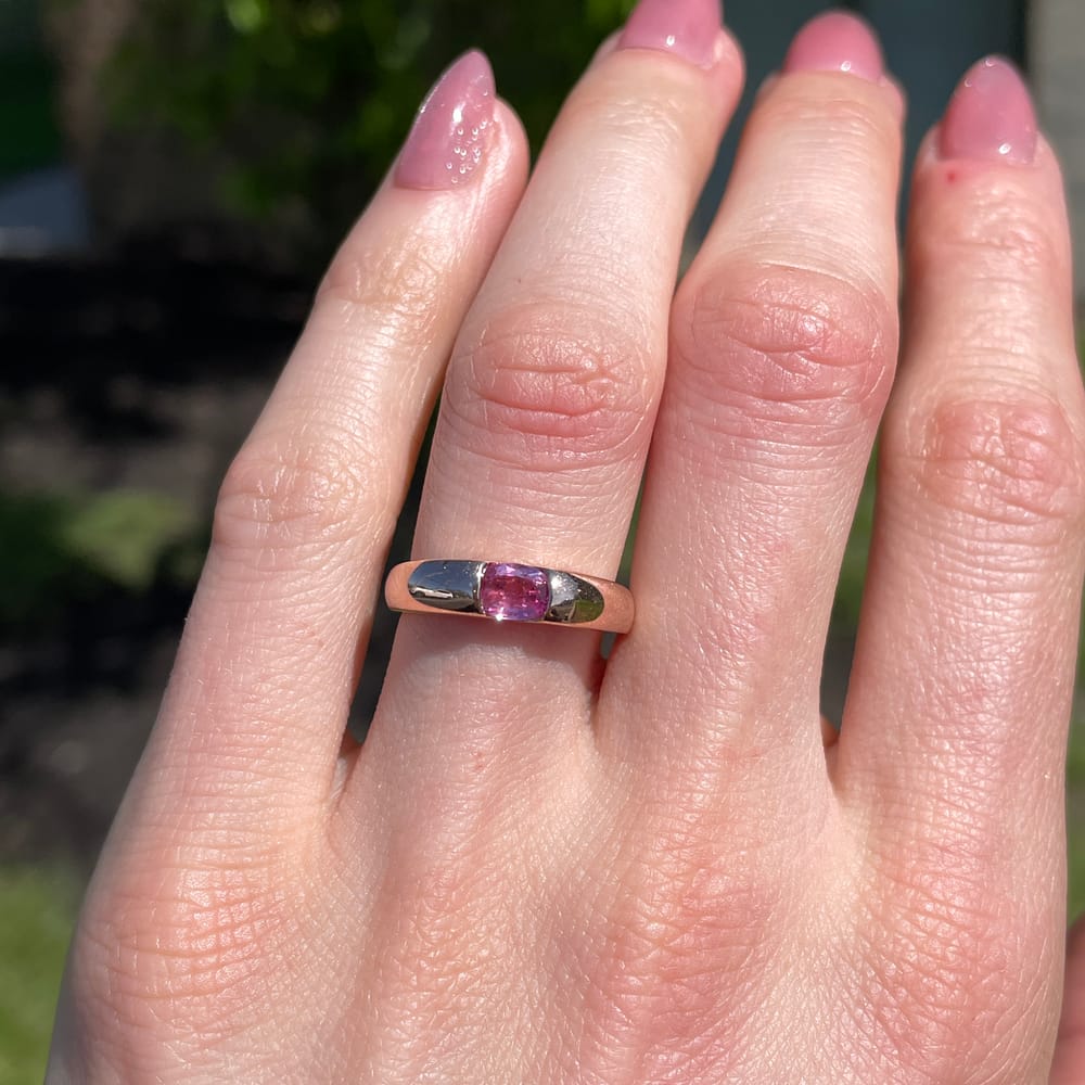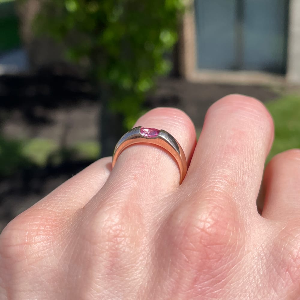 A 10K rose gold ring set with an oval pink topaz in an elegant east-west orientation, secured in a tension-style setting that allows light to pass freely through the stone, enhancing its vivid rosy hue. The warm blush of the gold complements the topaz’s natural saturation, while the horizontal placement lends a modern, architectural edge to the design. A refined piece that balances softness and structure, showcasing the beauty of the stone through clean, contemporary lines.