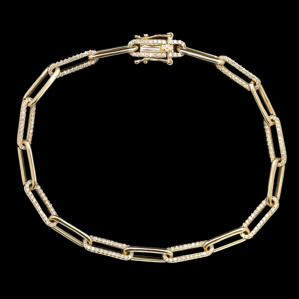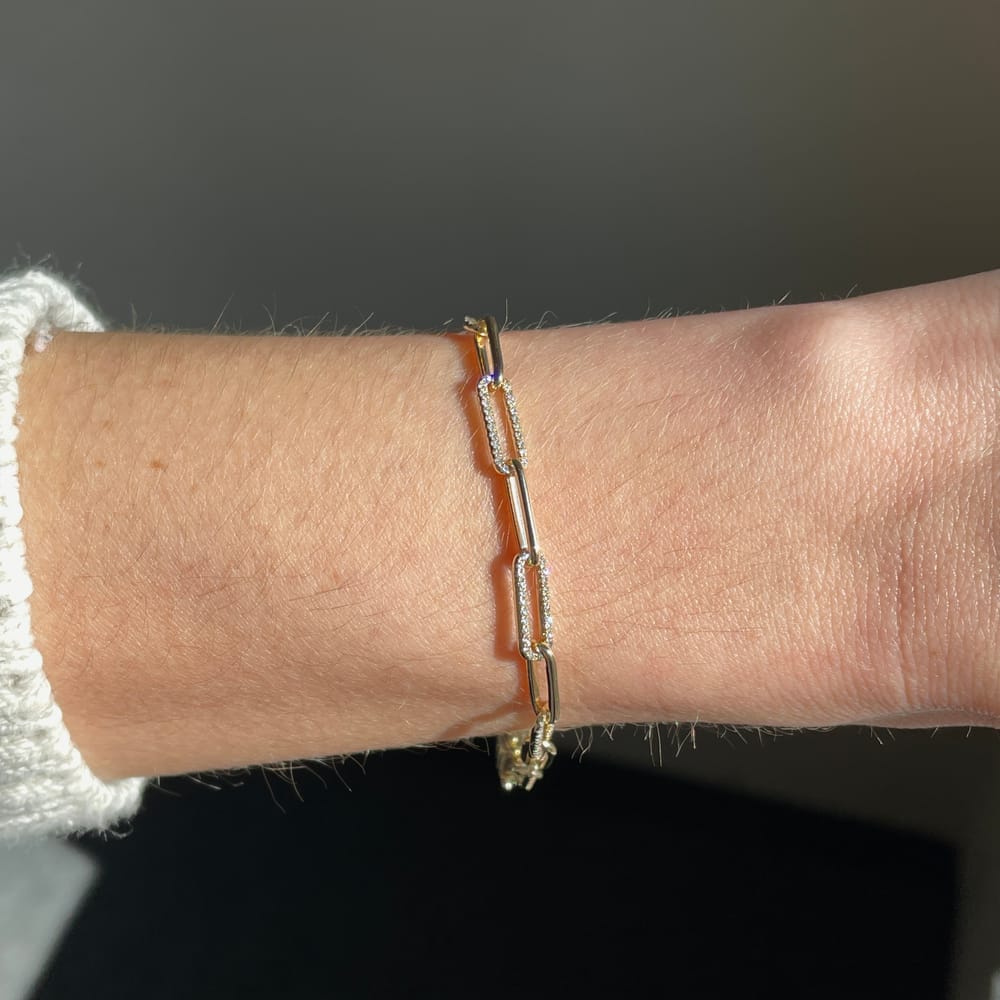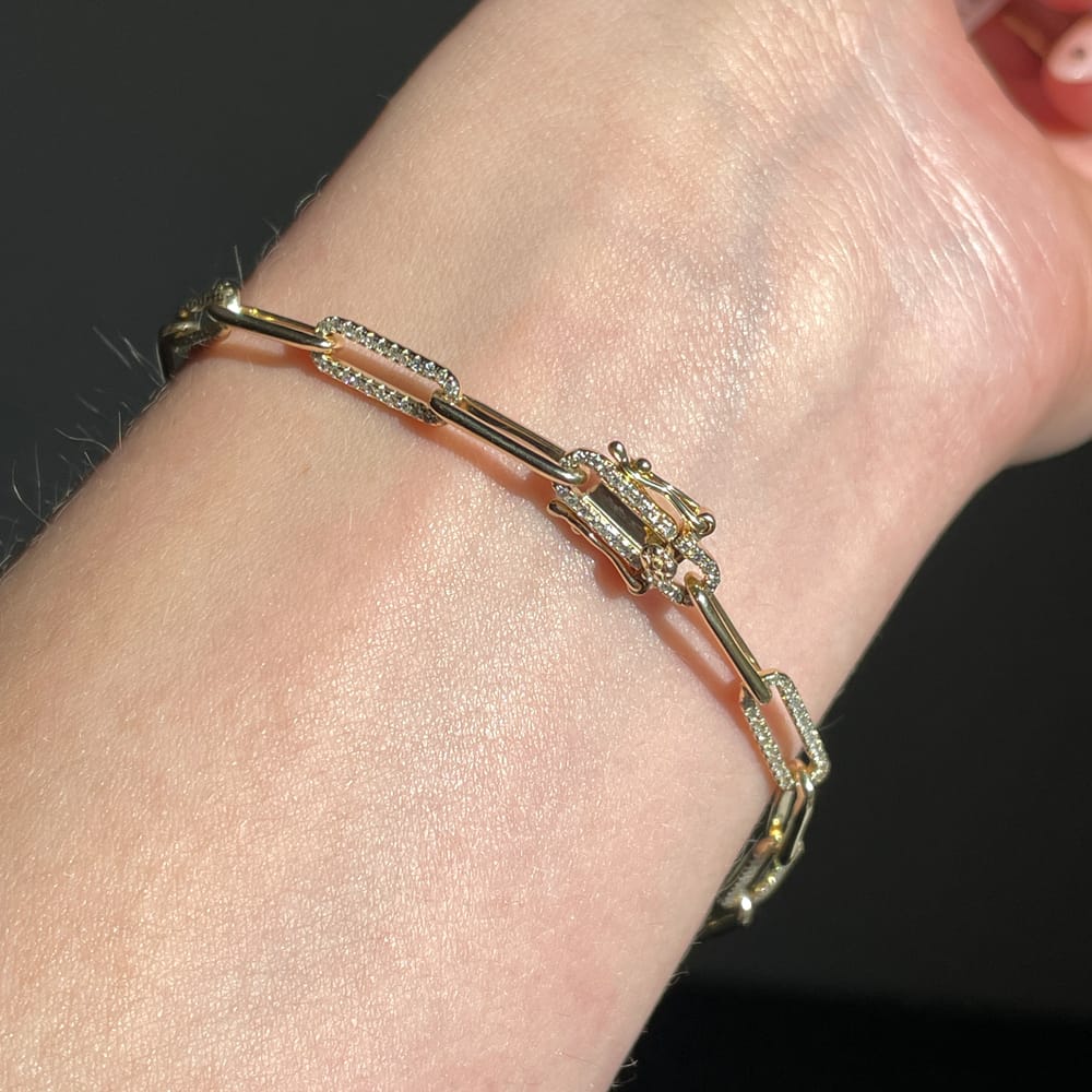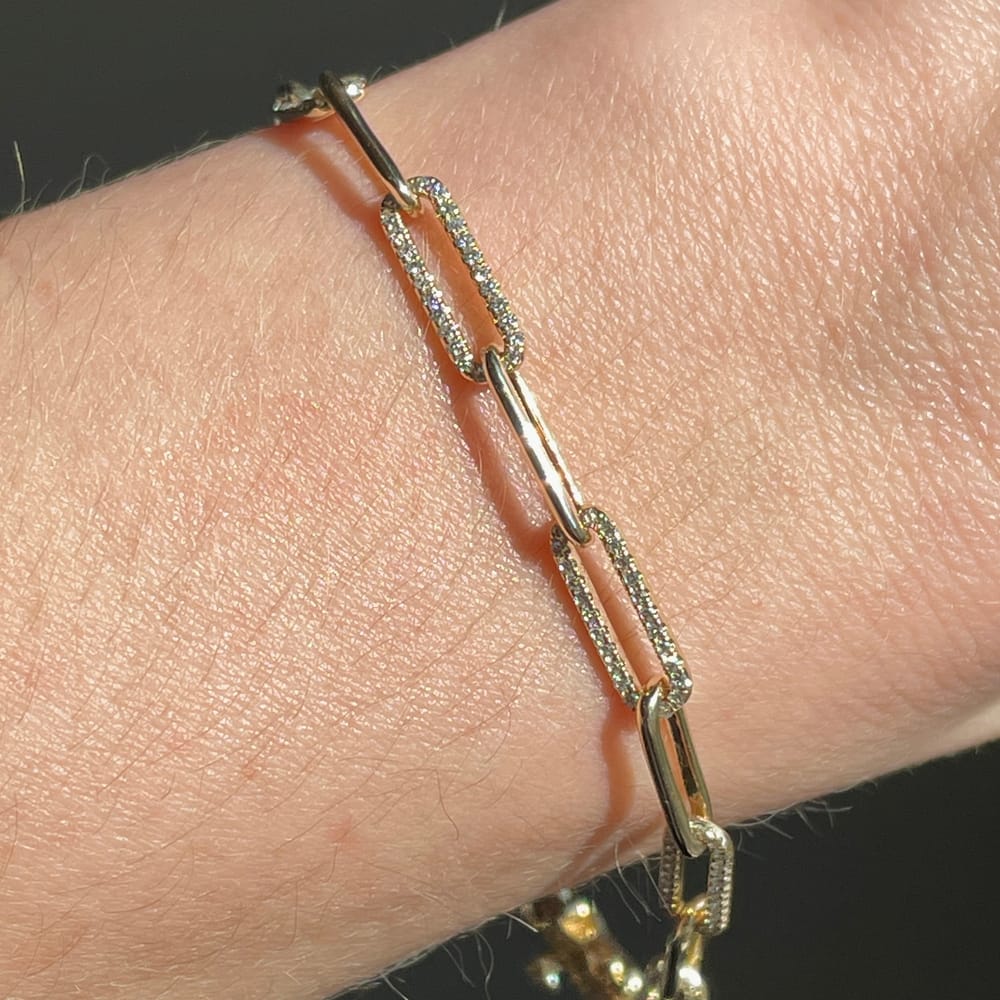 Crafted in polished 14K yellow gold, this paperclip link bracelet features an alternating rhythm of sleek plain links and diamond-set links, creating a refined balance of shine and brilliance. The natural diamonds, graded approximately SI1–SI2 clarity, add measured sparkle without overpowering the clean, elongated silhouette, resulting in a modern, structured design with enduring appeal.