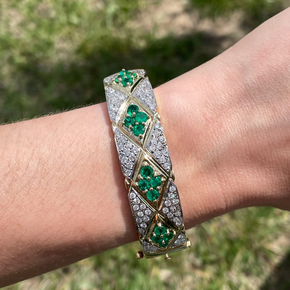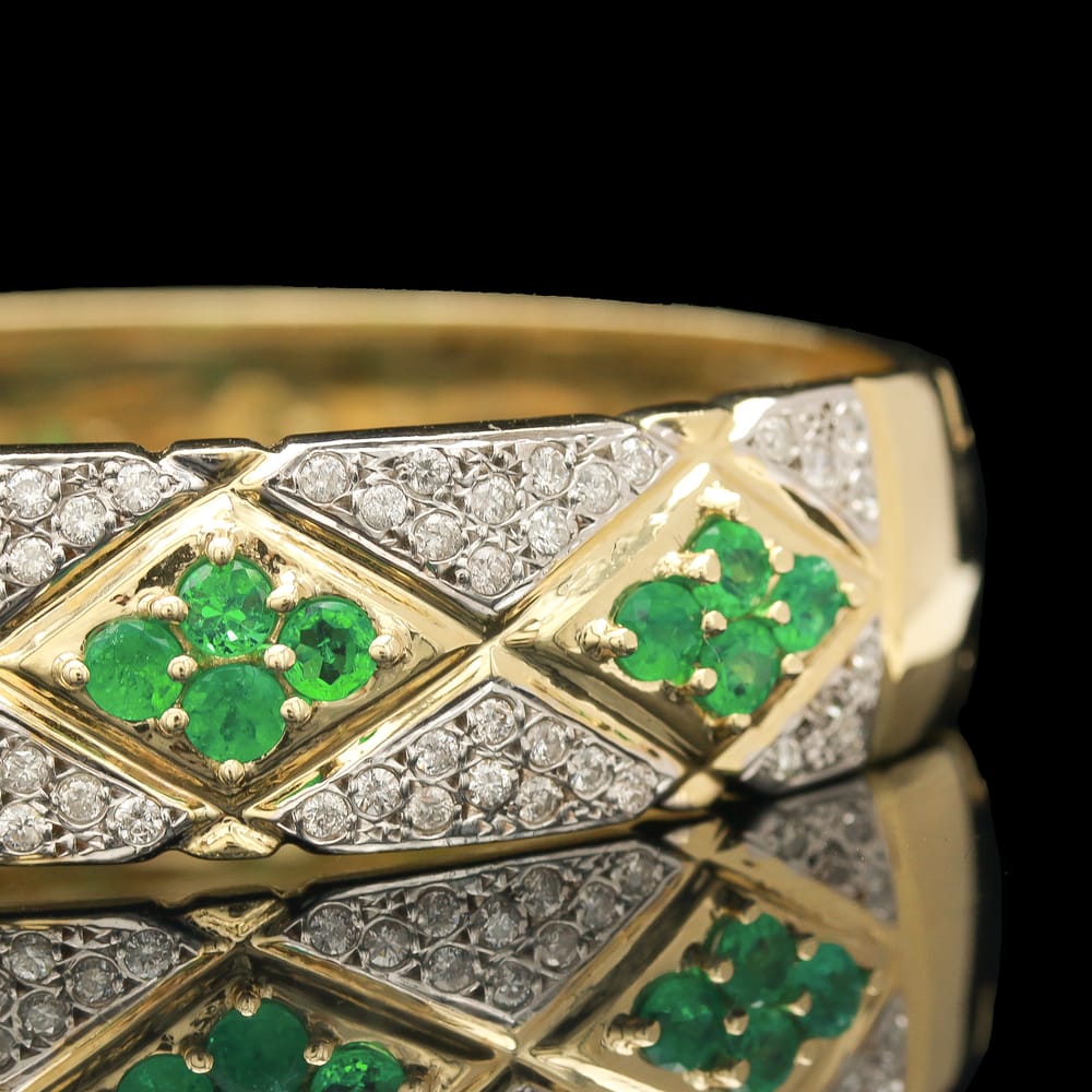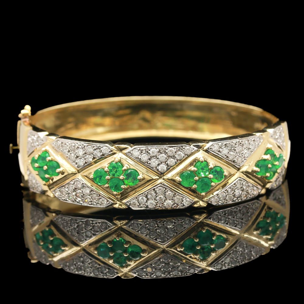 An extraordinary bangle bracelet crafted in 14K yellow gold, designed with a striking, almost serpentine pattern composed of repeating diamond-shaped motifs, each centered with a vivid round emerald, framed and interconnected by triangular sections of pavé-set diamonds that create a textured, scale-like effect across the wrist; the interplay of saturated green emeralds and shimmering diamond surfaces gives the piece remarkable depth and movement, resulting in a bold, highly distinctive design that feels both organic and architectural, with an unmistakable statement presence.