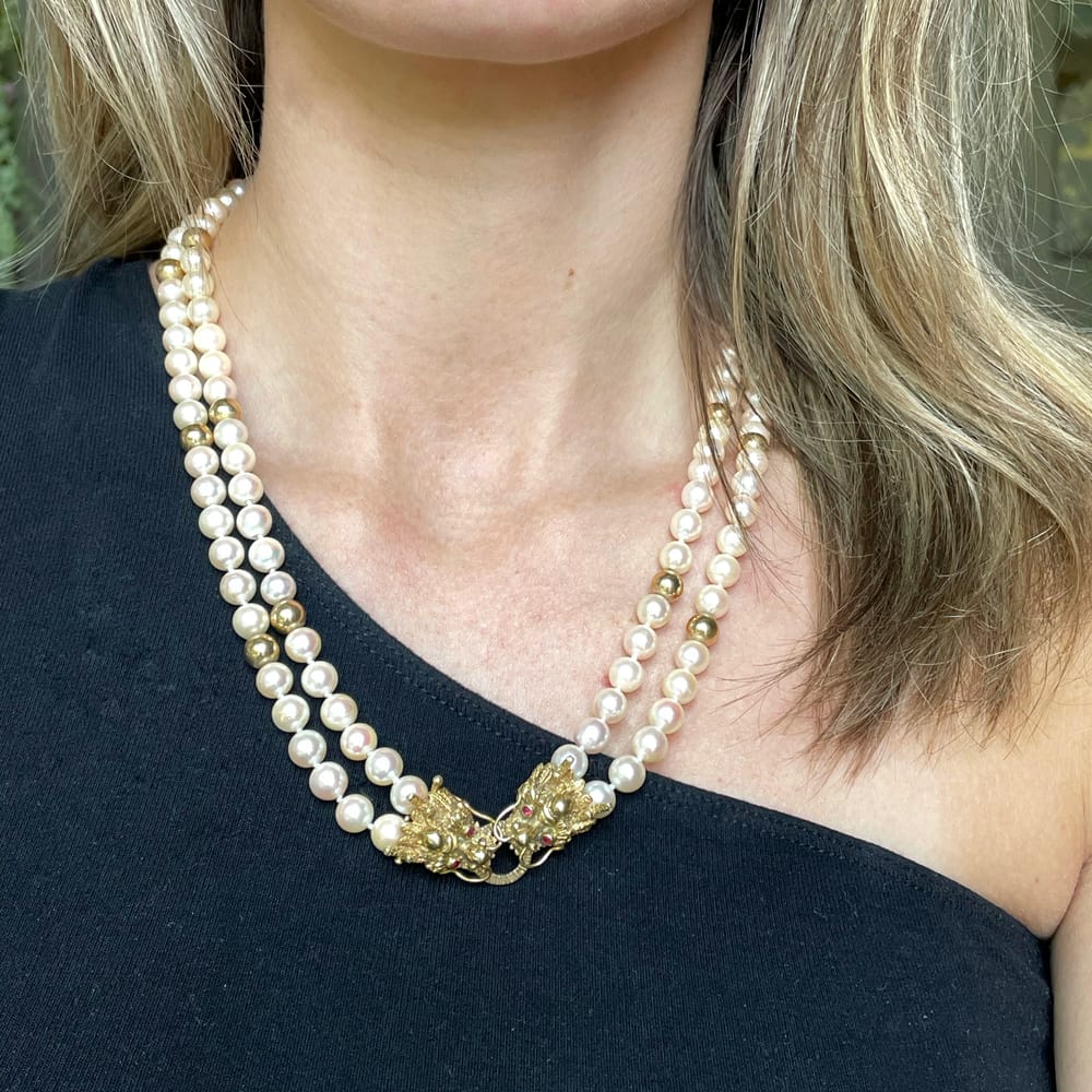 This incredibly unique necklace features double 6.6 mm Akoya pearl strands with accent gold beads and a double dragon head clasp featuring ruby eyes. The pearls display strong pink overtones.