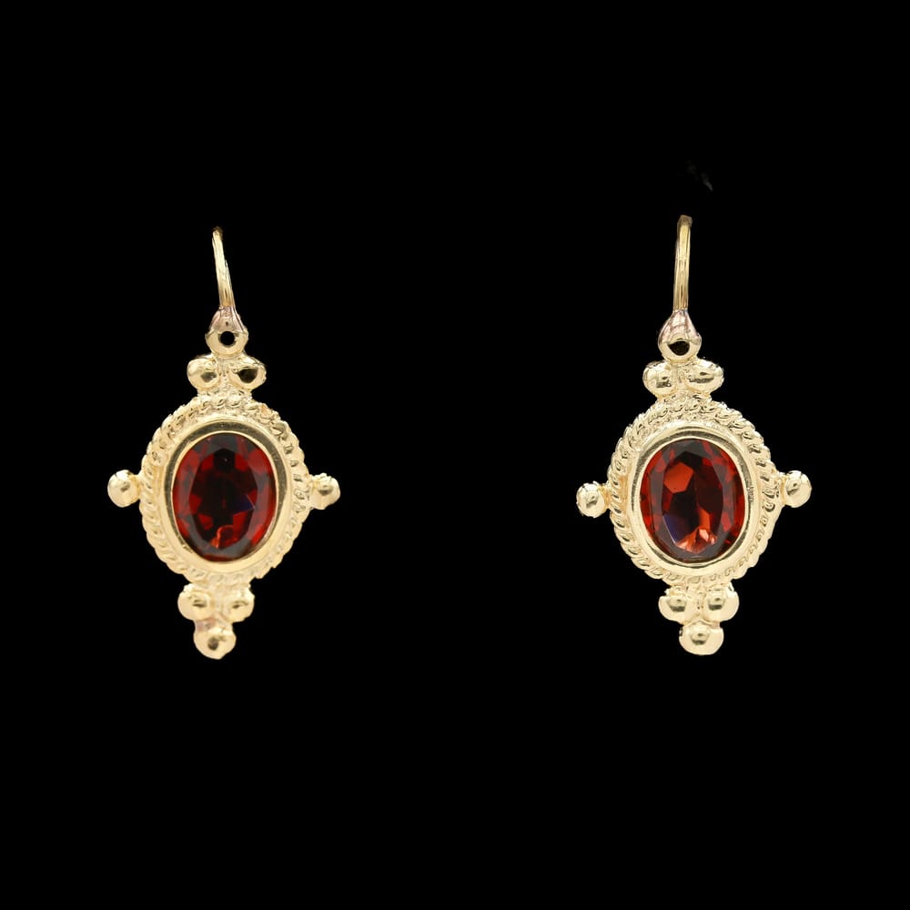 These polished 14K yellow gold earrings, featuring vibrant red garnets, are the perfect accessory for women seeking a chic and modern touch.