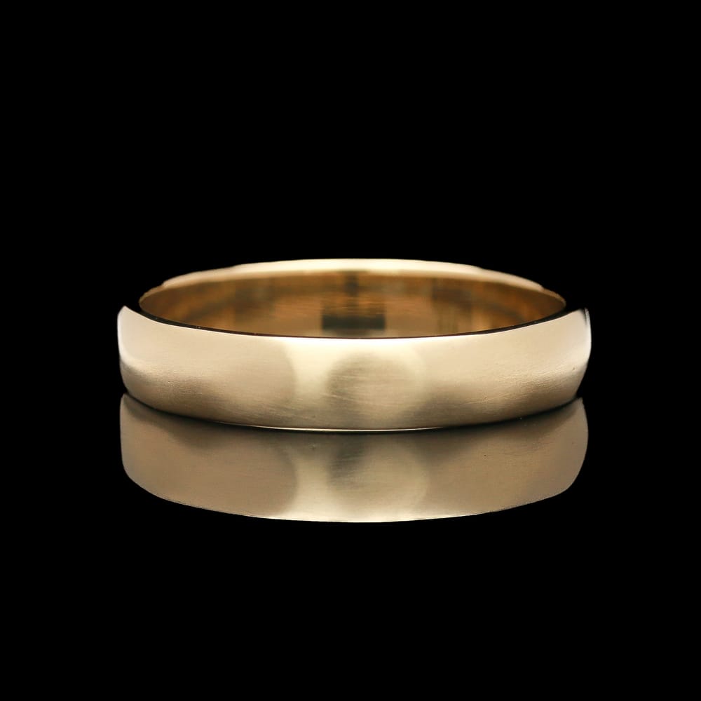 A bold geometric band crafted in 14K yellow gold, designed with an angular, rock-like surface that evokes the natural facets of stone, finished in a soft satin texture that enhances its dimensional character while muting reflection. The structured, tactile design gives the ring a strong, masculine presence, balancing rugged inspiration with refined craftsmanship for a distinctly modern statement.