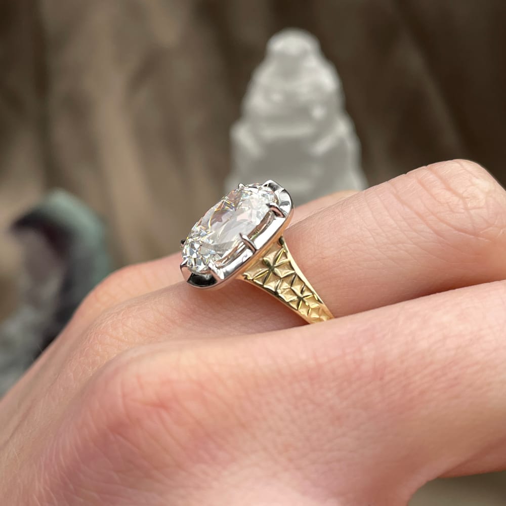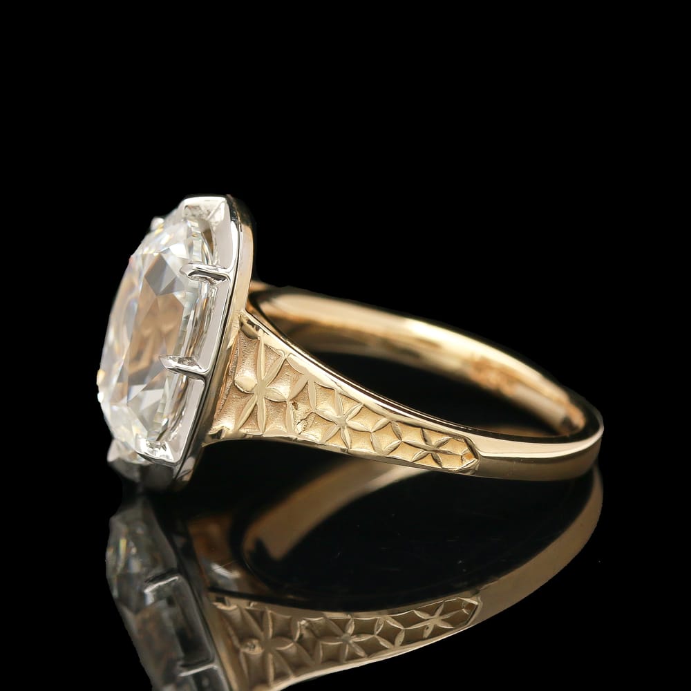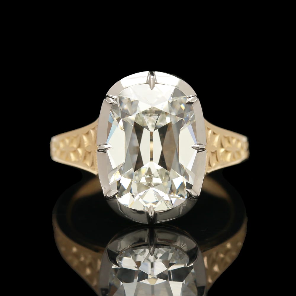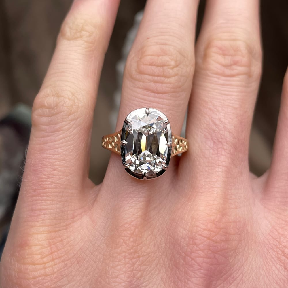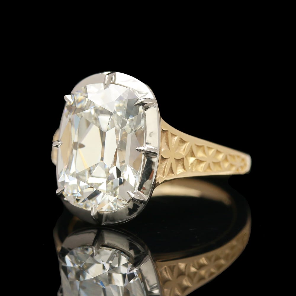 This stunning 5.32 carat cushion-shaped lab-grown diamond ring features a VVS2 clarity center stone set in rich 14K yellow gold with elegant antique-style claw prongs. Inspired by the much-discussed Taylor Swift–style ring that sparked widespread attention for its timeless cushion cut and refined proportions, this design blends vintage romance with modern craftsmanship. The warm gold setting enhances the diamond’s brilliance and old-world character, creating a bold yet sophisticated statement piece that feels both iconic and enduring.
