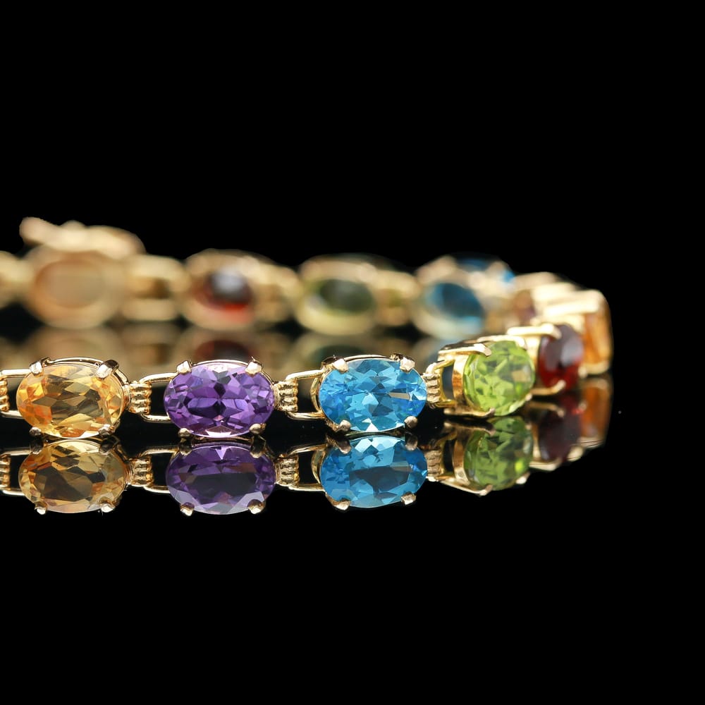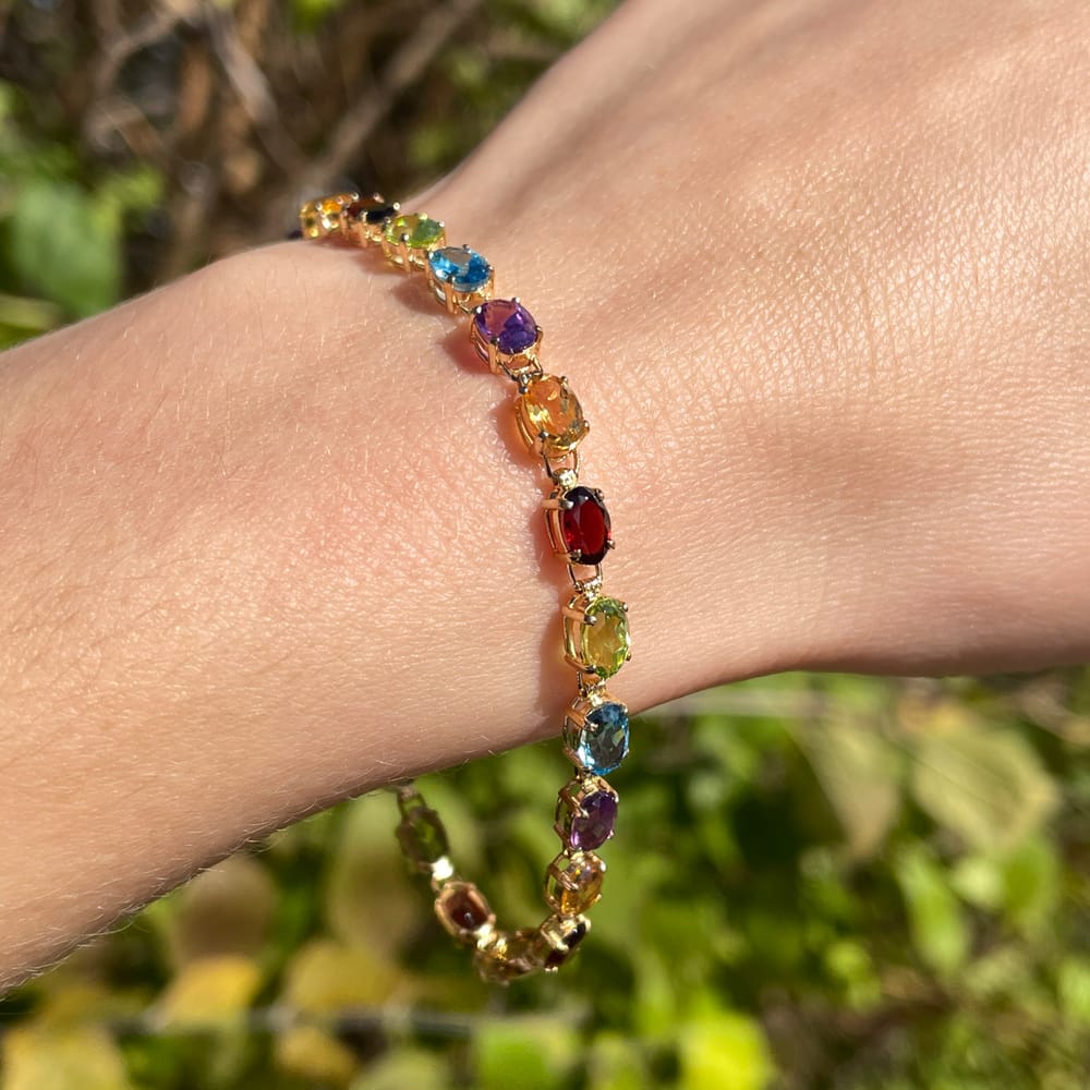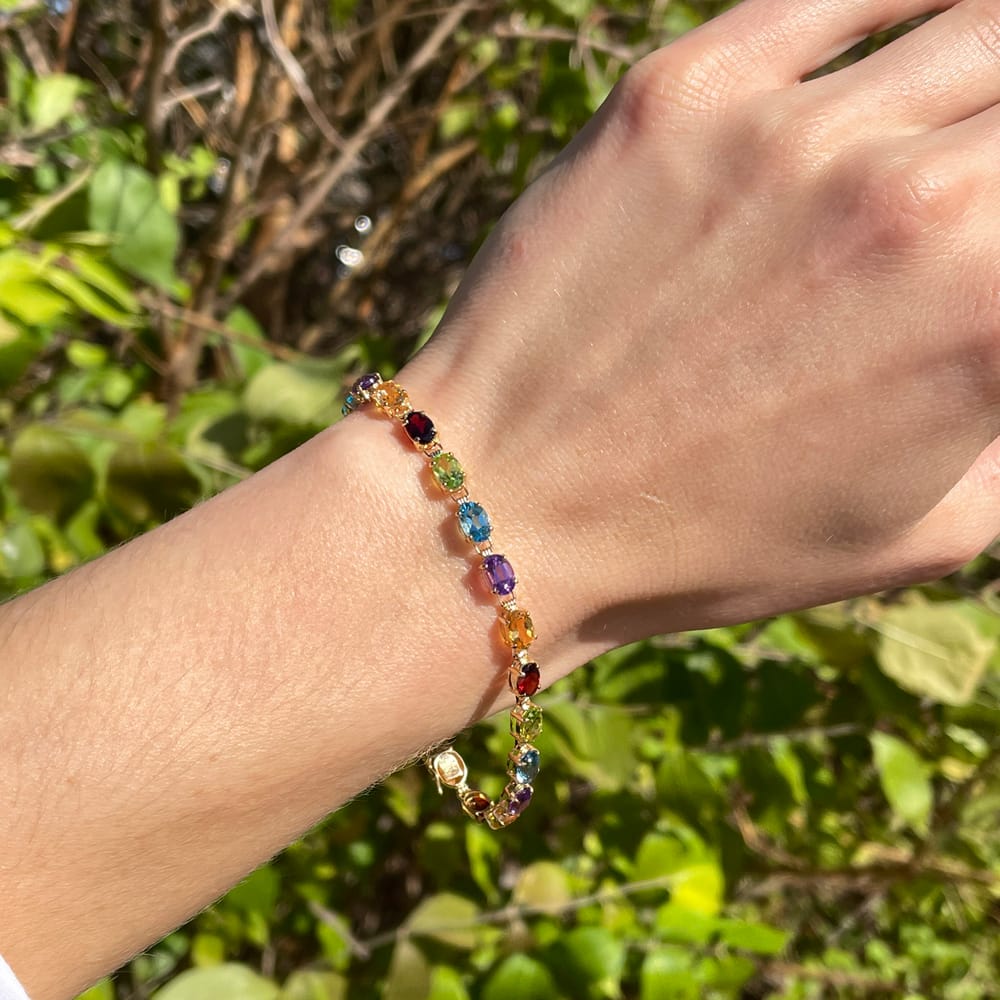 This exquisite line bracelet is adorned with an array of colorful oval-cut amethyst, citrine, garnet, peridot, and blue topaz, all set in polished 14k yellow gold.