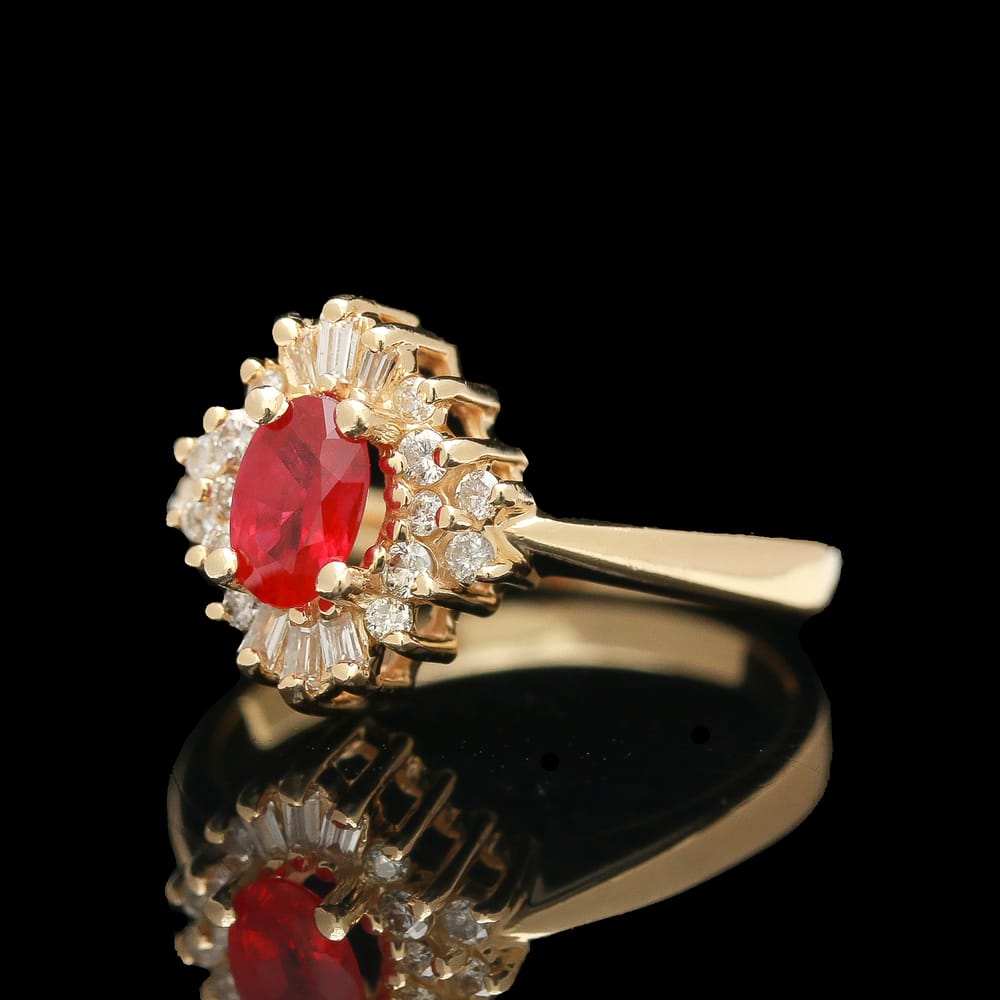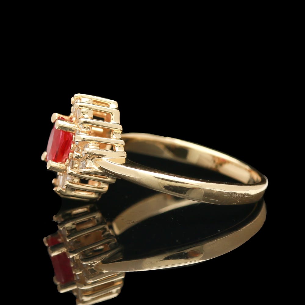 A classic halo ring crafted in 14K yellow gold, centered on a vibrant ruby with a rich, saturated red hue, encircled by a halo of natural diamonds that amplify the stone’s color and add a radiant frame of brilliance. The warm gold setting enhances the overall depth and contrast, creating a timeless and elegant piece that highlights the enduring appeal of ruby and diamond pairing.