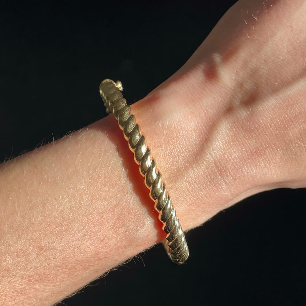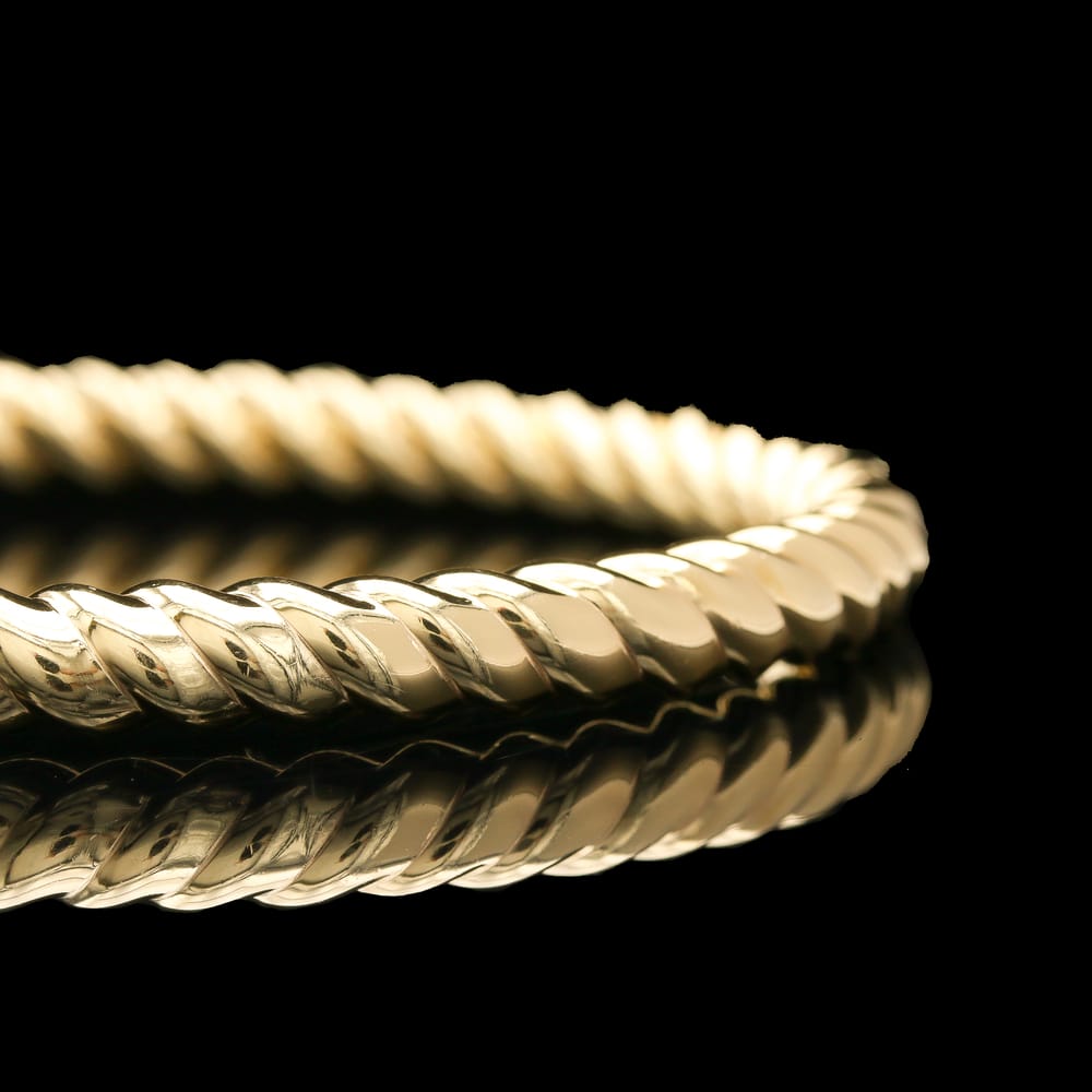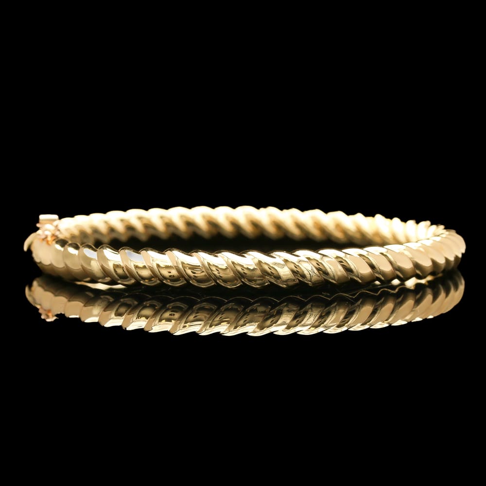 This elegantly polished bangle features a classic twist design, crafted in luxurious 14K yellow gold, perfect for any occasion.