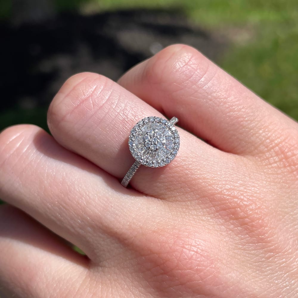 An 18k white gold 0.75 ctw Diamond cluster ring with round and baguette cut Diamonds.