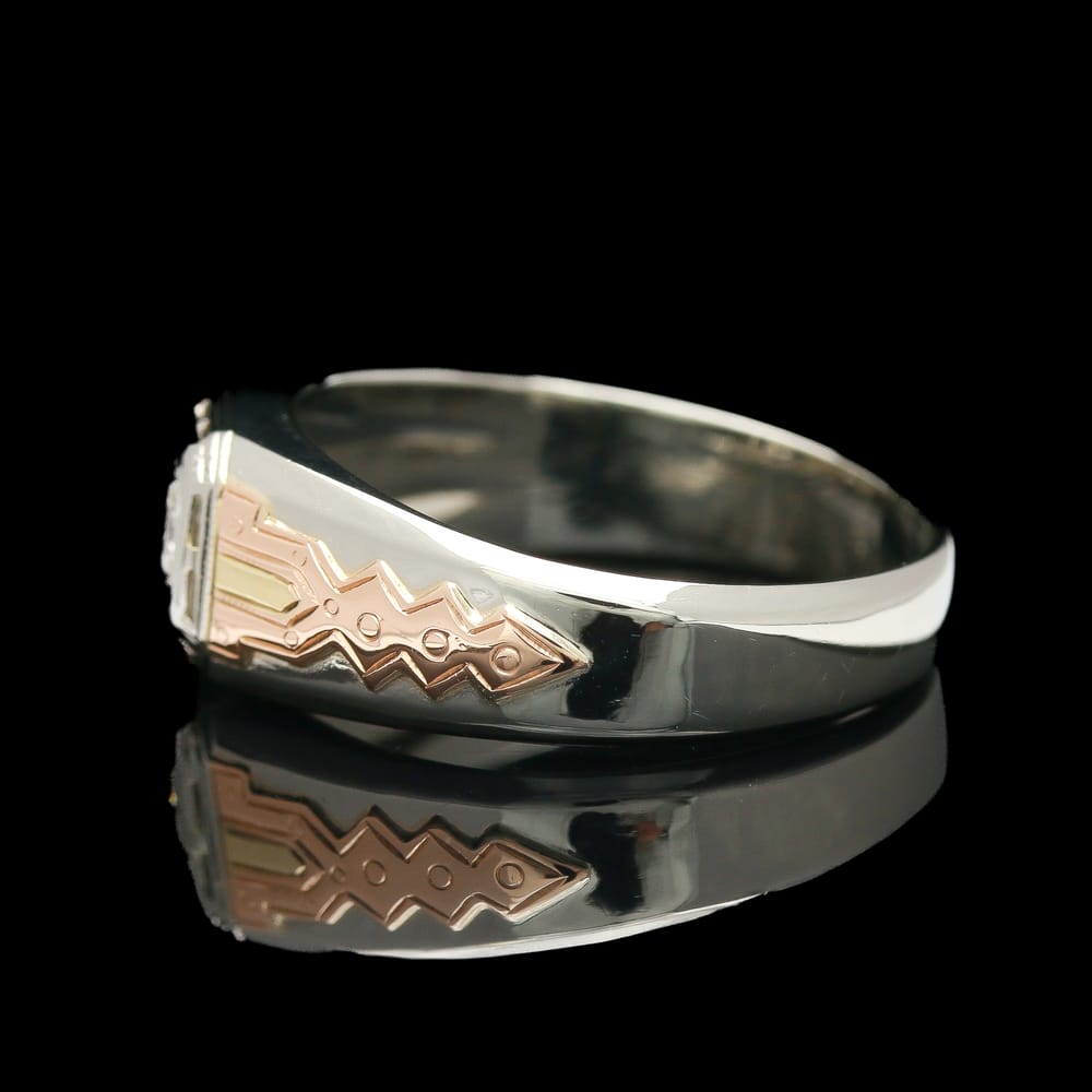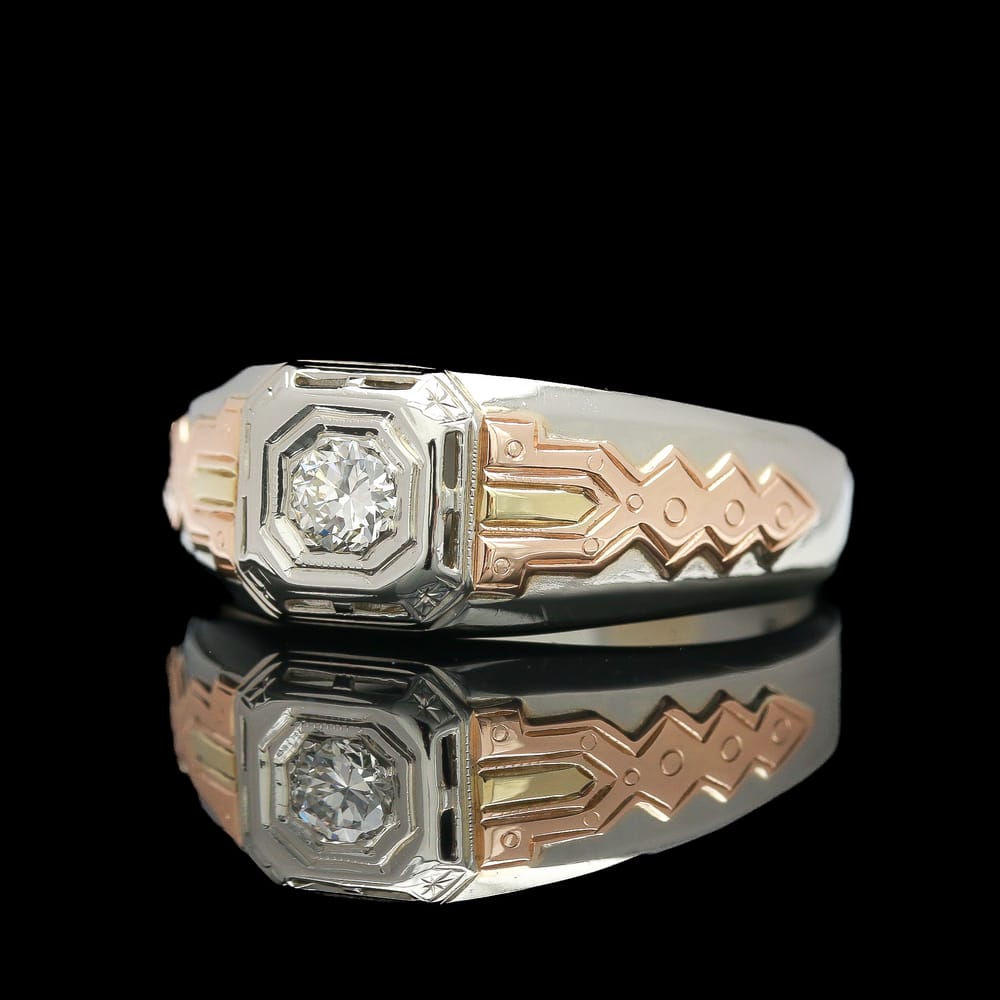 This exquisite ring features a brilliant round diamond of 0.18 carats, showcasing impressive SI1 clarity and a warm I color. Crafted from luxurious 18K gold, it combines white, yellow, and rose metals in a contemporary design, perfect for the modern woman.