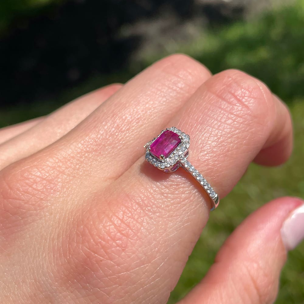 An 18k white gold emerald cut Ruby and Diamond halo ring.
