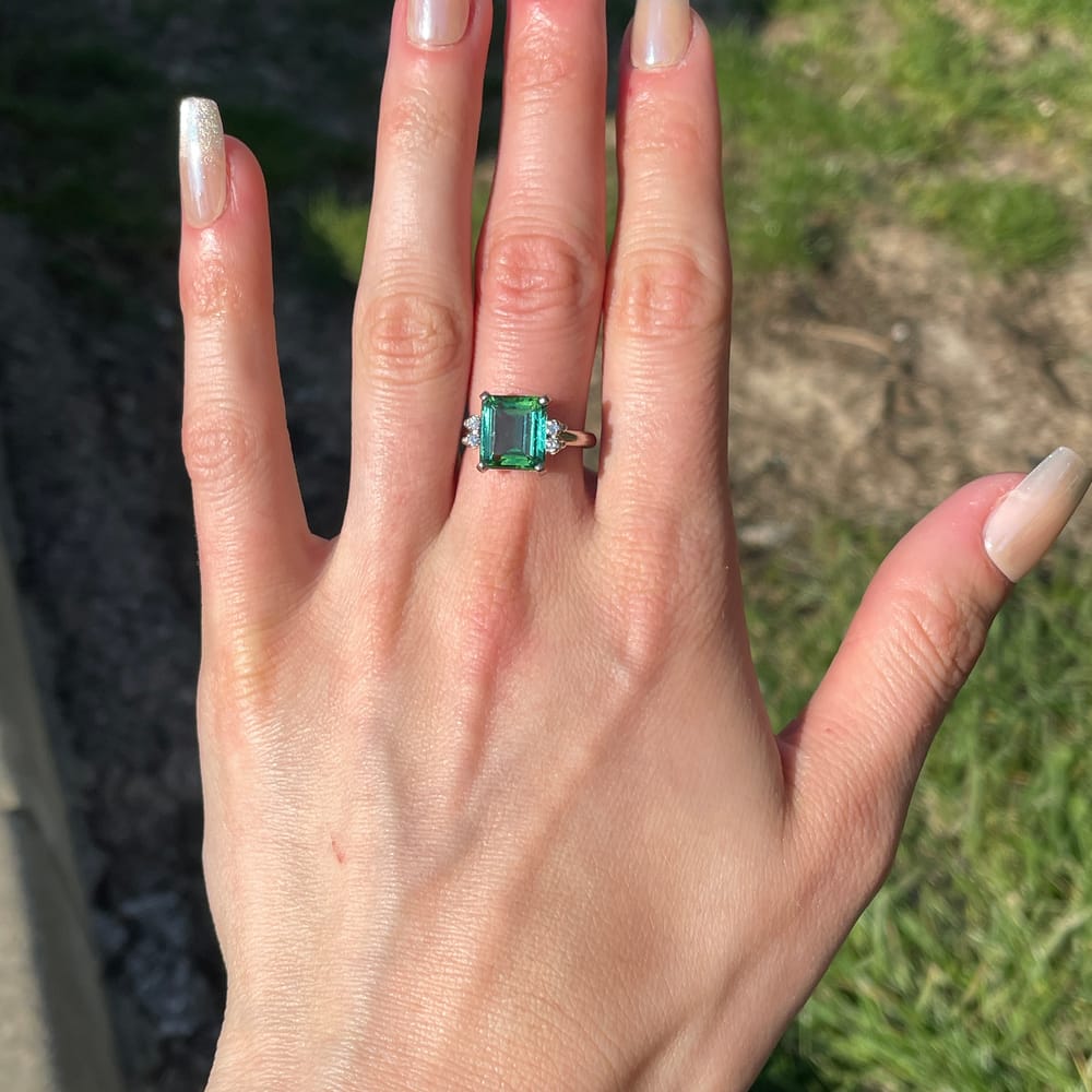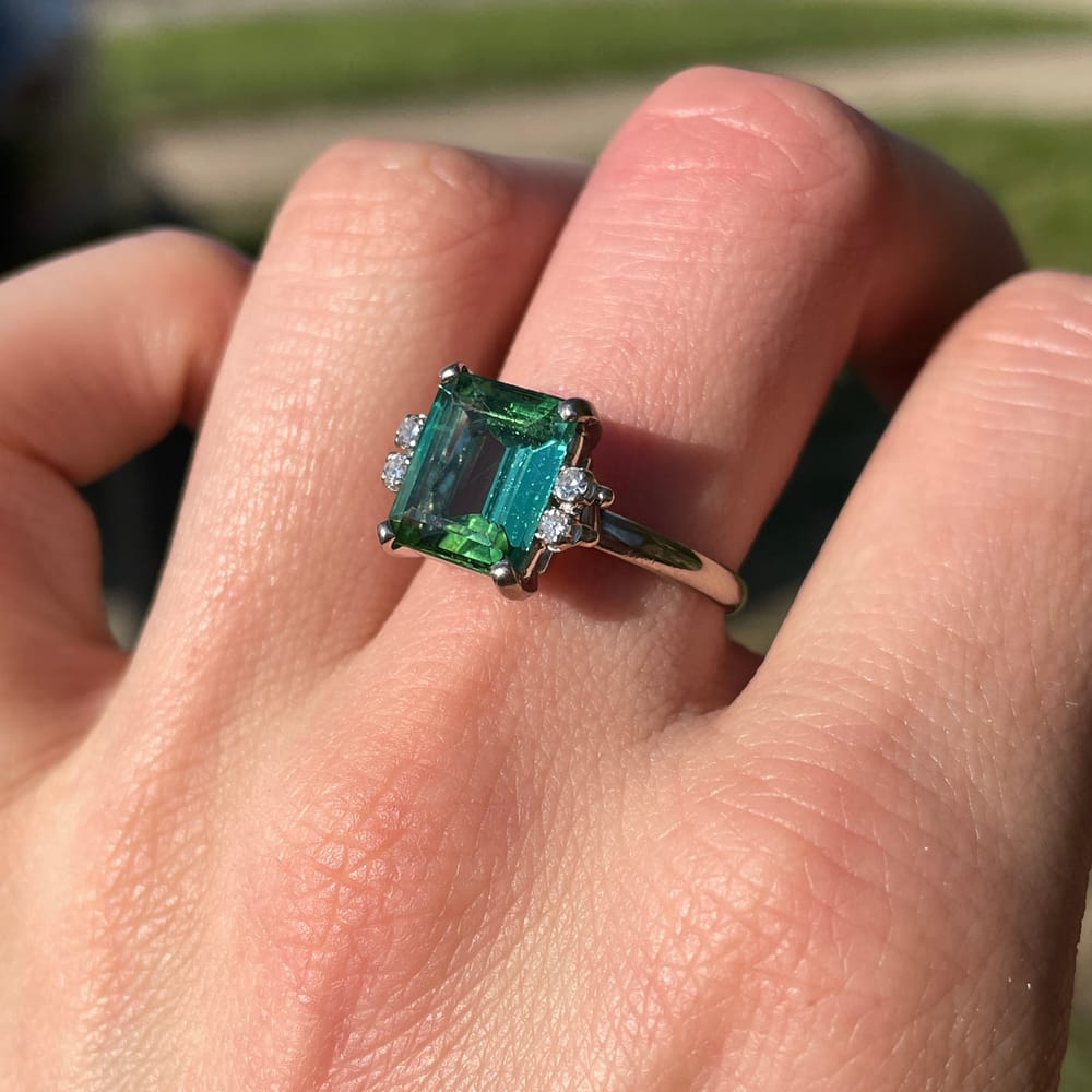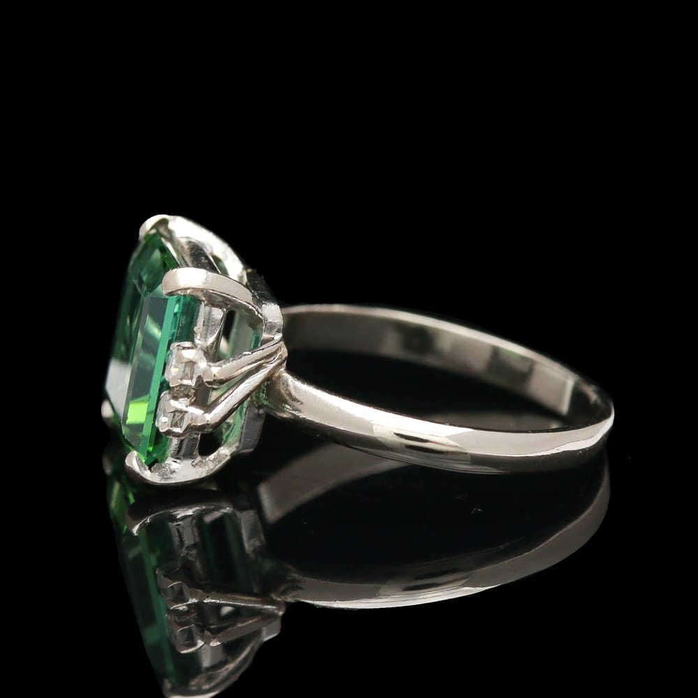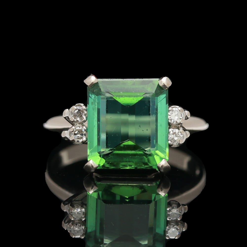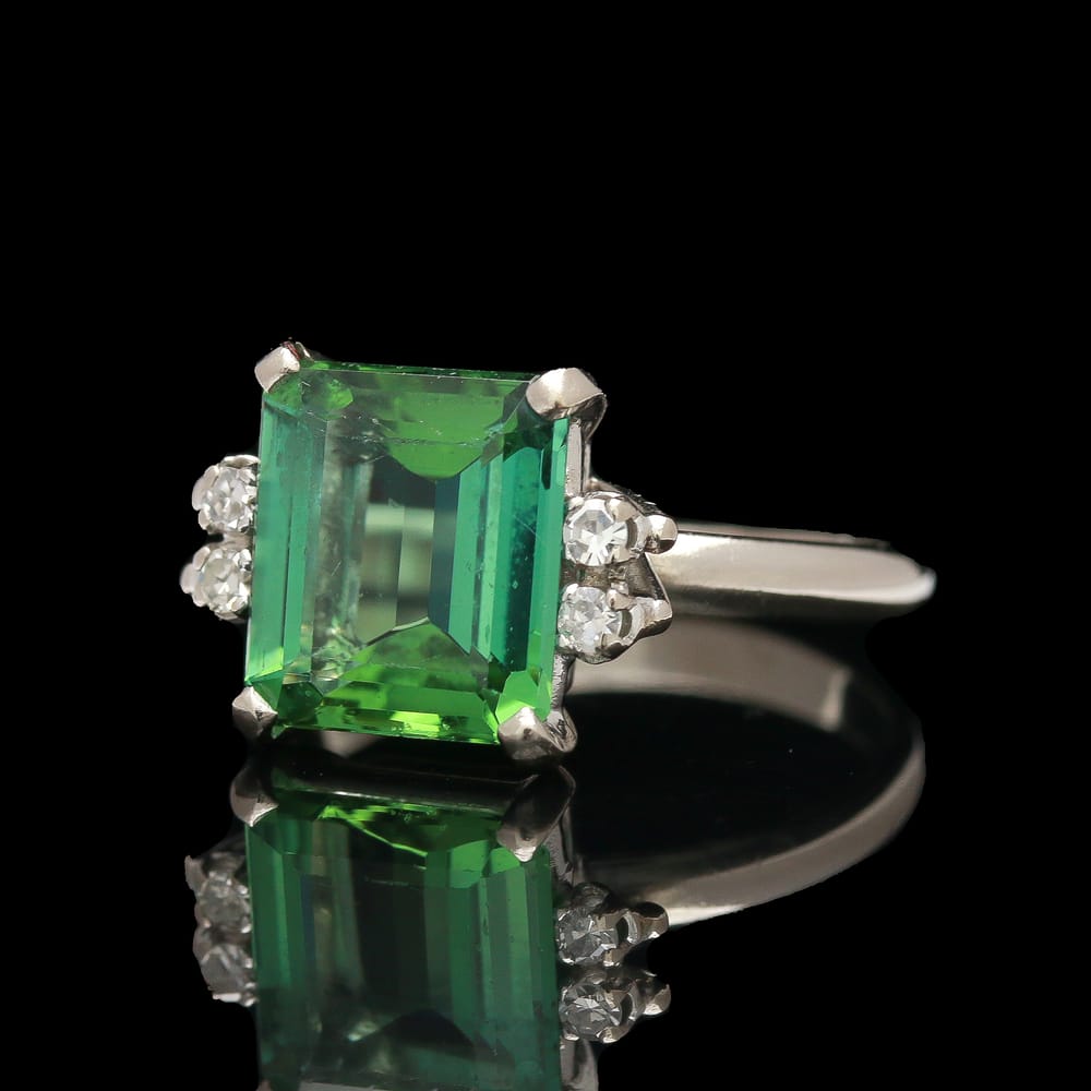 A contemporary ring centered on a rare square-cut tourmaline displaying an exceptional mint green hue, a highly sought-after tone distinguished by its soft yet luminous presence, set in polished 18K white gold that enhances the stone’s cool clarity, with round diamond accents adding a refined brilliance and subtle contrast; the clean geometry of the cut paired with the unusual coloration creates a piece that feels both modern and distinctive, highlighting the scarcity and appeal of fine mint green tourmaline.
