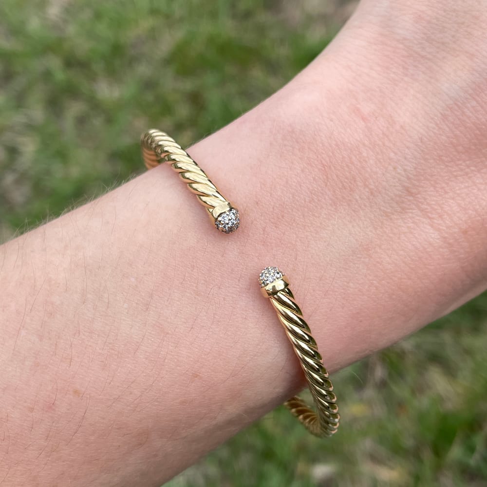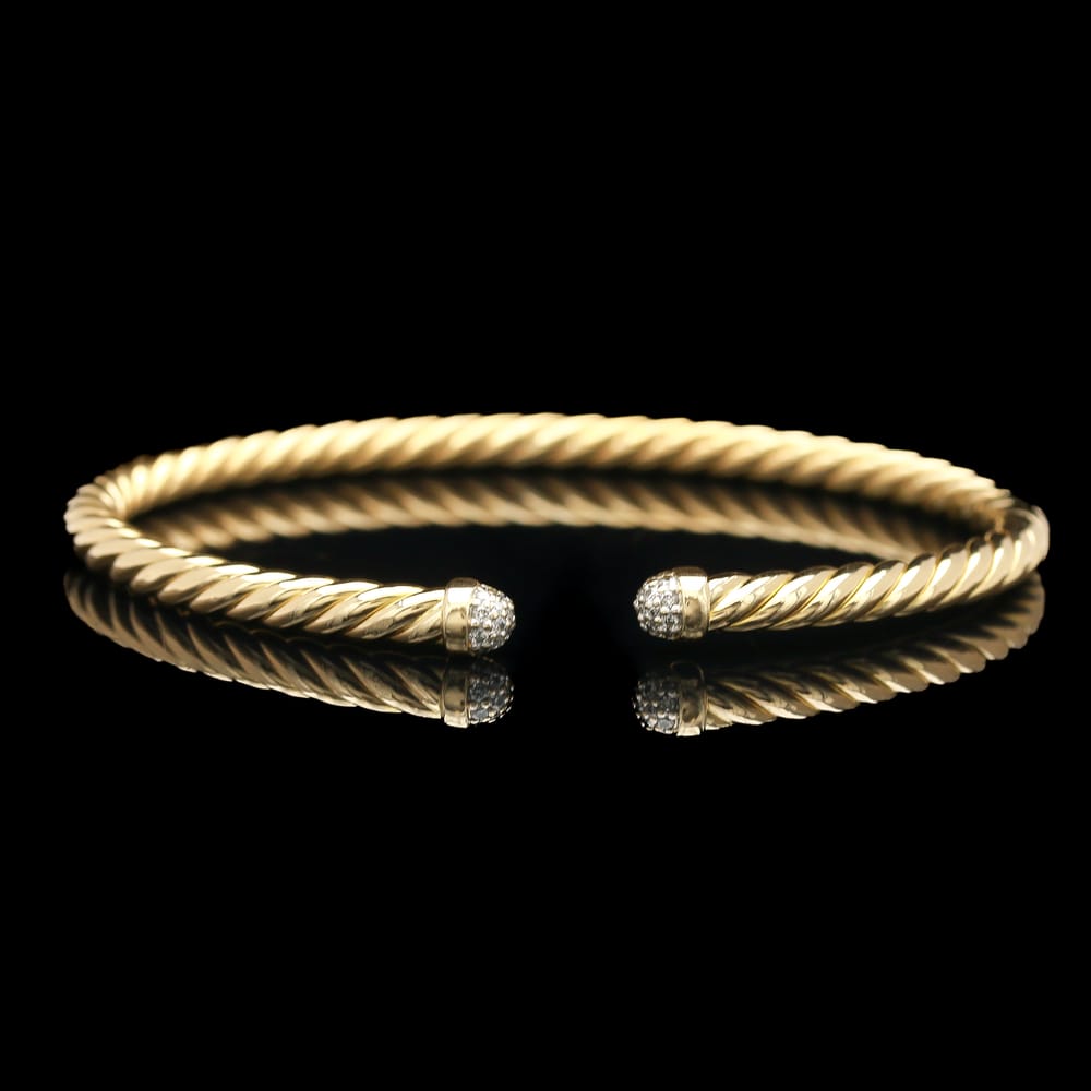 A sculptural cuff bracelet crafted in 18K yellow gold, designed in an elegant twist form that wraps the wrist with fluid, dynamic movement, terminating in softly contoured, knotted ends richly pavé-set with round diamonds that add concentrated brilliance and texture at each point; the interplay of polished gold and clustered sparkle creates a bold yet refined statement, balancing modern design with a timeless sense of luxury.