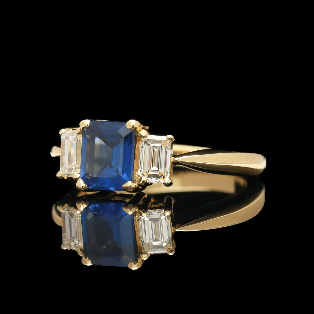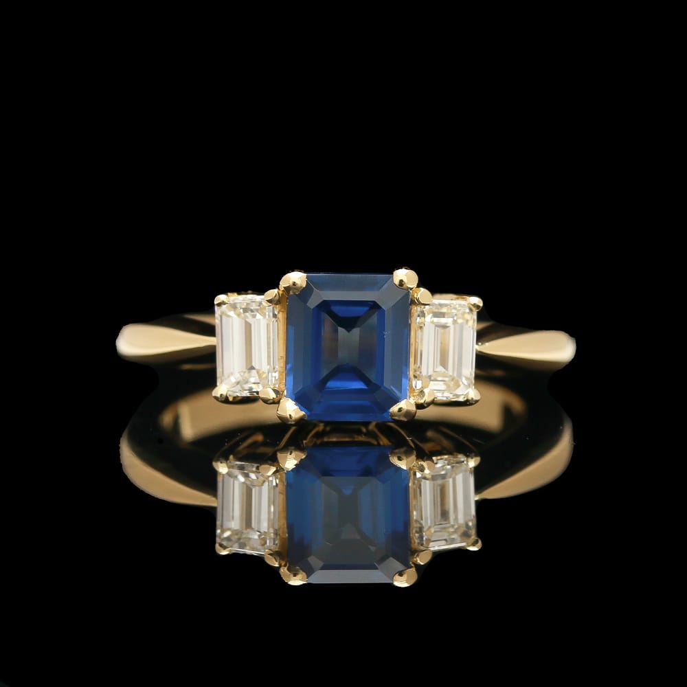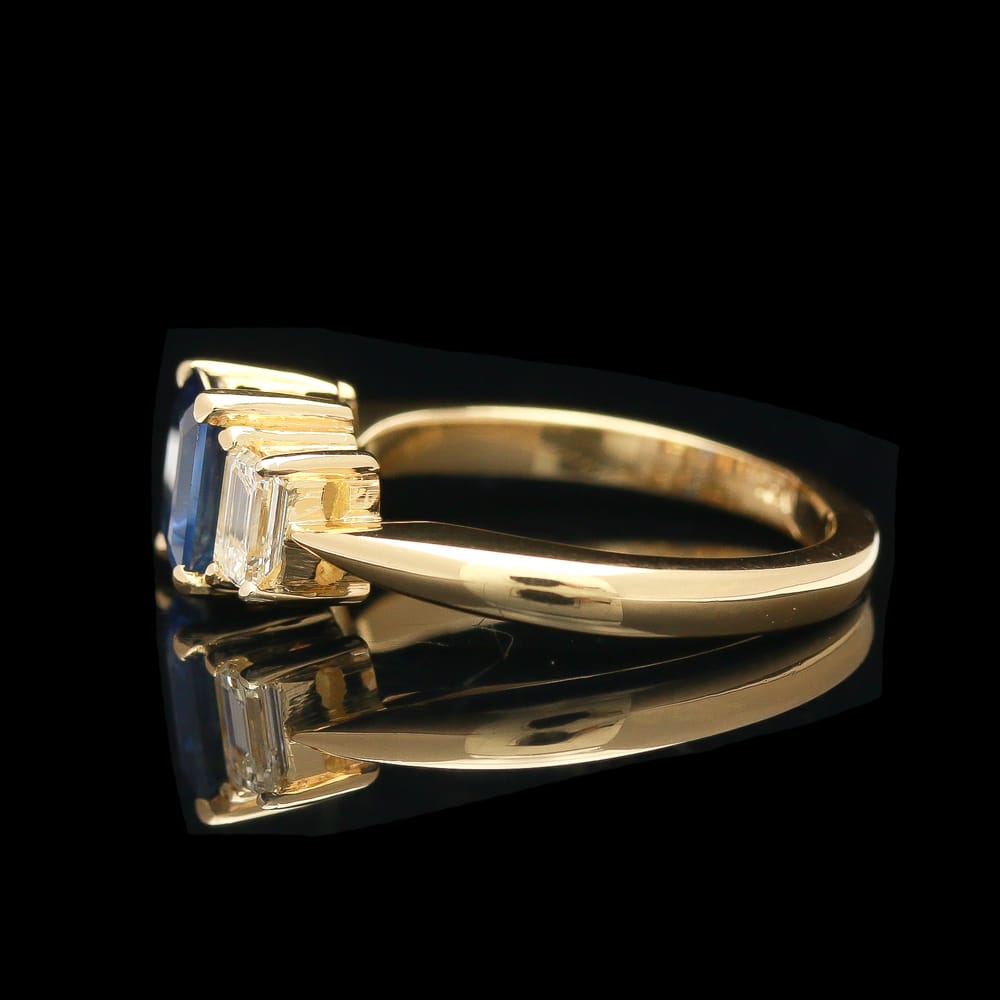 A refined three-stone ring crafted in 18K yellow gold, centered on a 1.23 carat sapphire displaying a silky blue hue with soft, elegant saturation, flanked by elongated emerald-cut diamonds that lend a clean, linear brilliance to the composition; the pairing of the richly colored center stone with the structured side stones evokes a strong Art Deco sensibility, while the overall execution remains distinctly contemporary, resulting in a balanced and sophisticated design with timeless appeal.