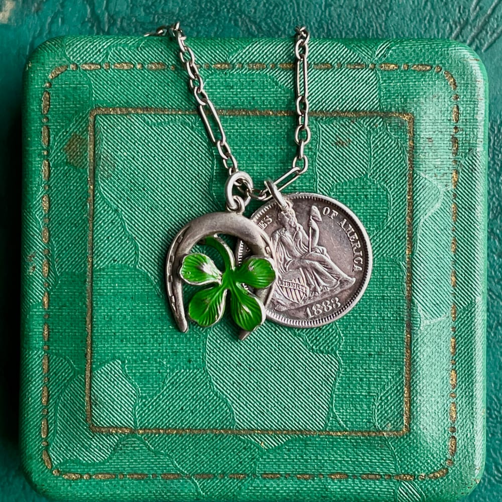 This exquisite necklace features an antique sterling silver love token intricately combined with a vibrant enamel good luck charm and featured on an antique trombone link chain. The love token is an 1883 Liberty Seated dime and engraved “Carrie” to the verso.