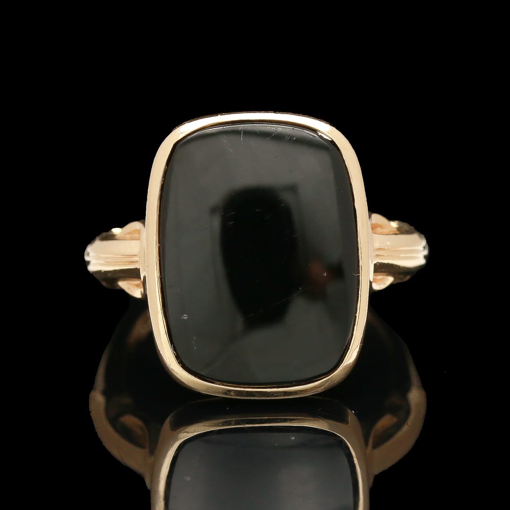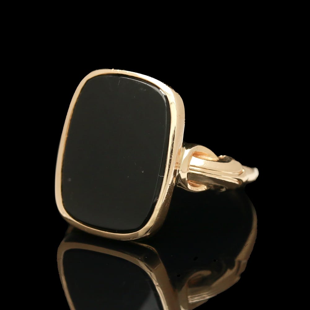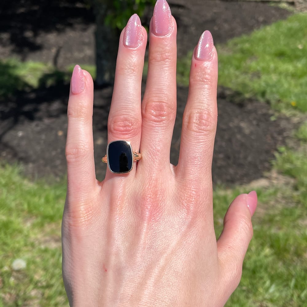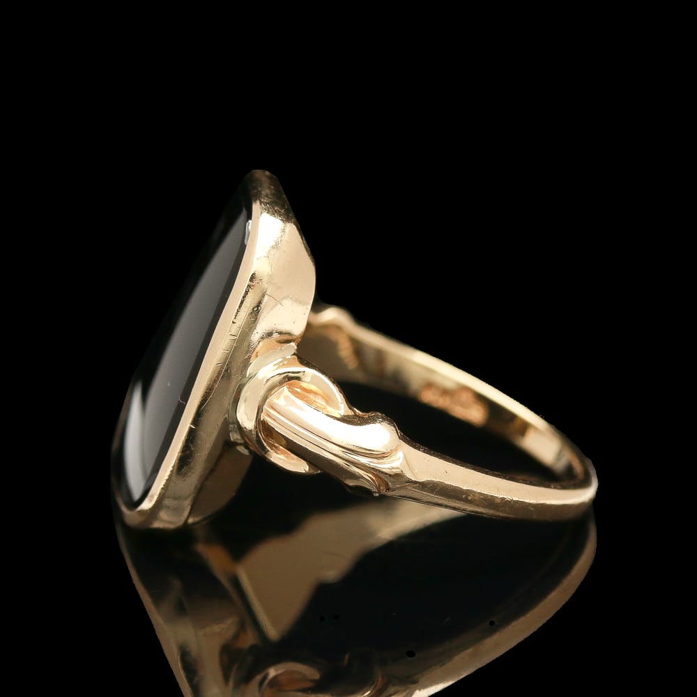 This exquisite Art Deco 10K yellow gold signet ring features a smooth black onyx stone, blending antique elegance with modern allure for the discerning woman.