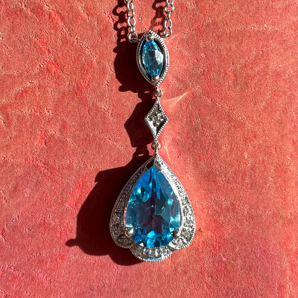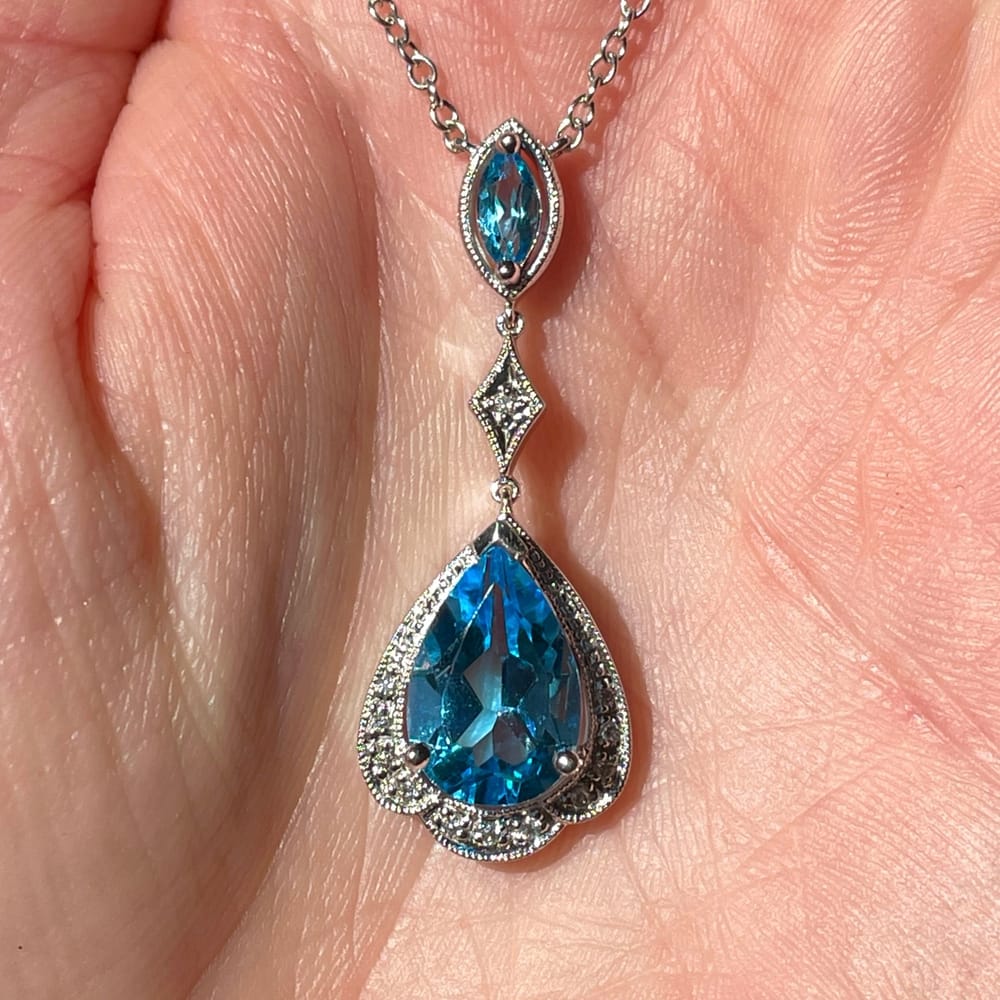 This exquisite necklace features a dazzling pear-shaped Swiss blue topaz center stone complemented by a marquise blue topaz and 16 brilliant round diamonds, elegantly crafted in polished 14K gold with intricate milgrain details.