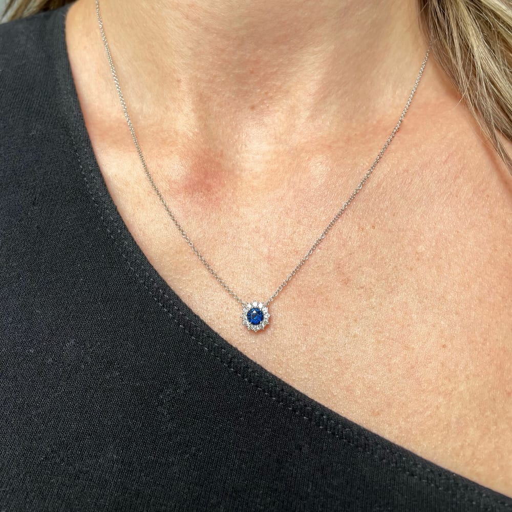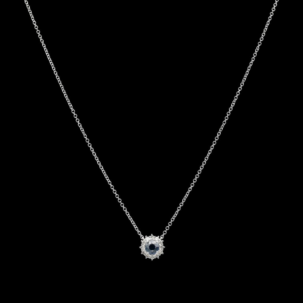 This exquisite pendant features a captivating round blue sapphire surrounded by a halo of brilliant diamonds, elegantly set in polished 14K white gold.