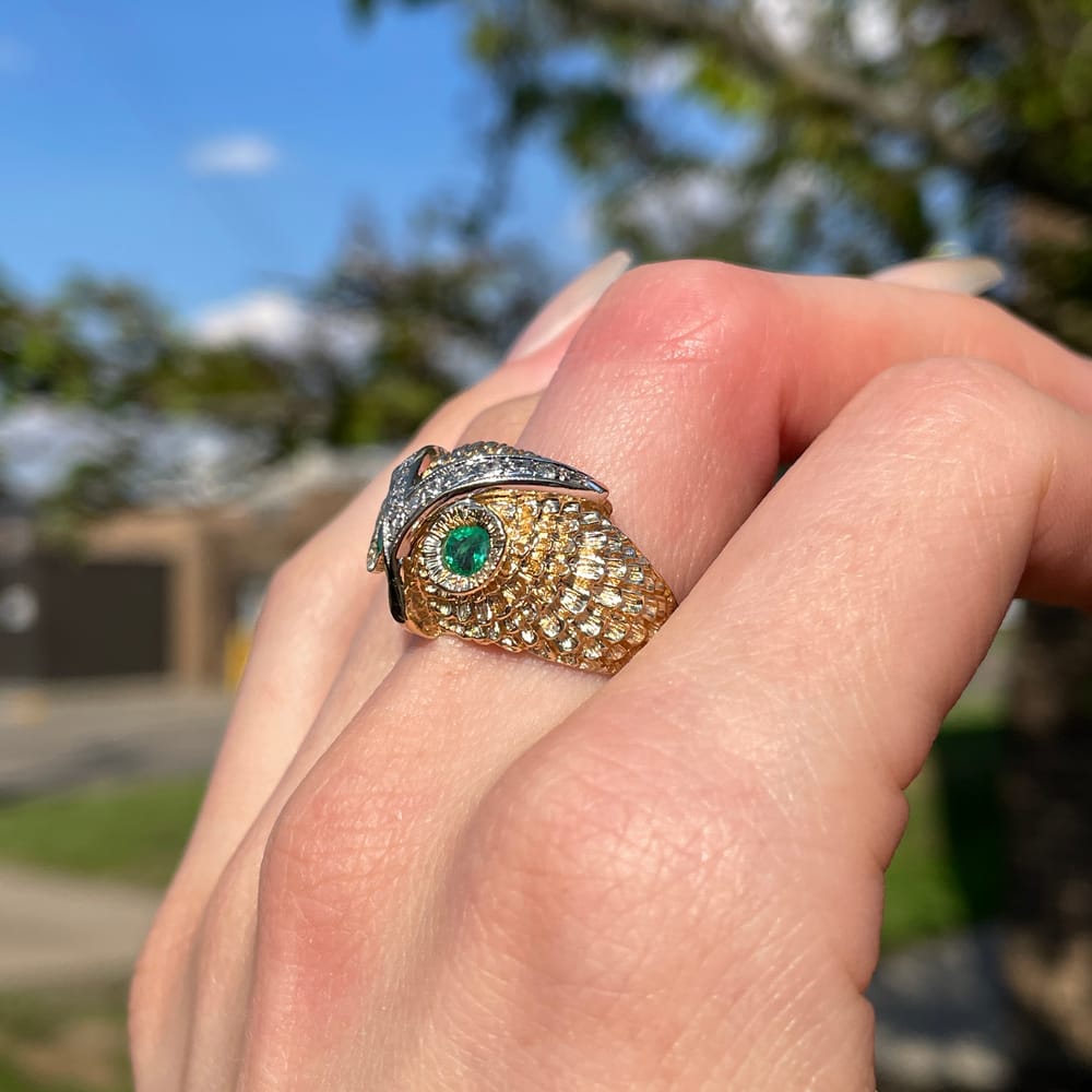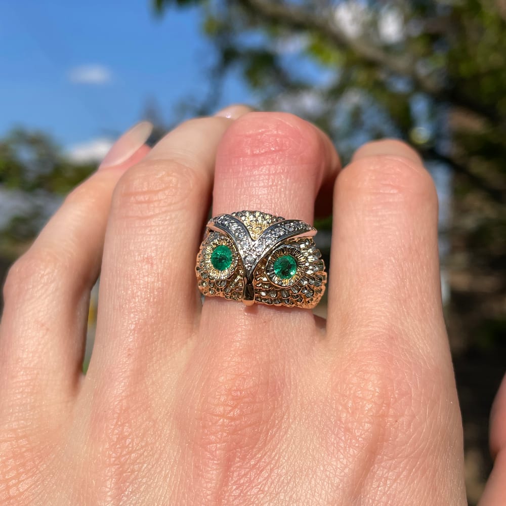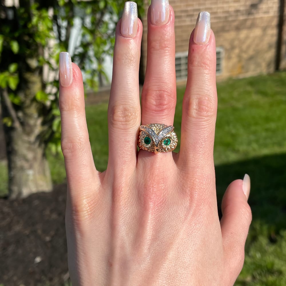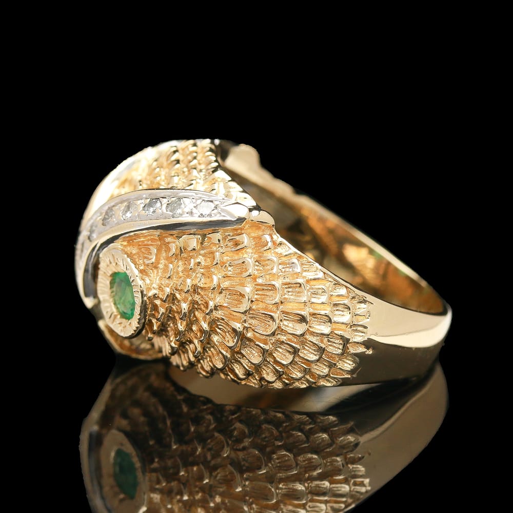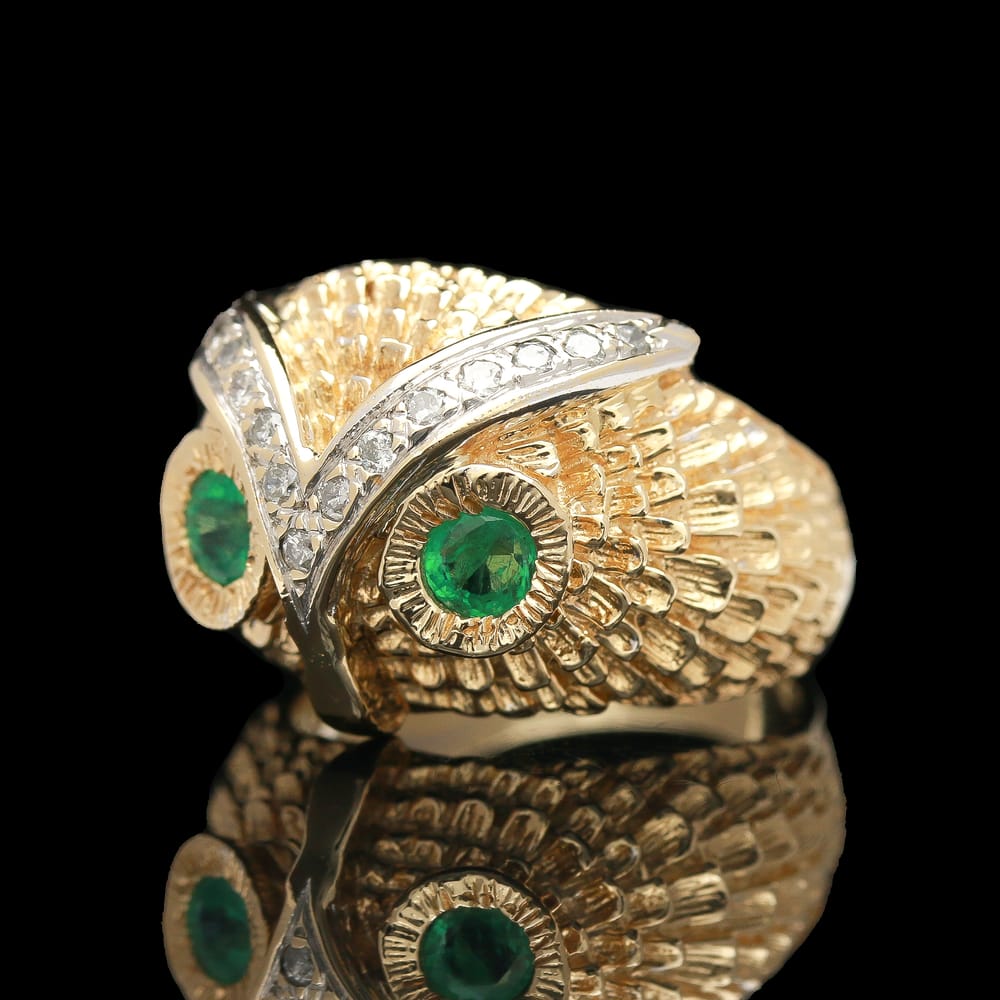 A finely detailed vintage owl head ring rendered in solid 14K yellow gold, the sculptural form richly textured to capture the character and depth of the bird’s face, centering a vivid round emerald totaling approximately 0.30 carats, its saturated green hue drawing the eye and lending a lifelike intensity to the design, while natural diamonds accent the composition with subtle brilliance, thoughtfully set to highlight the dimensional craftsmanship and expressive features; a distinctive and whimsical yet refined statement piece, exemplary of mid-century figural jewelry with careful attention to detail and enduring charm.