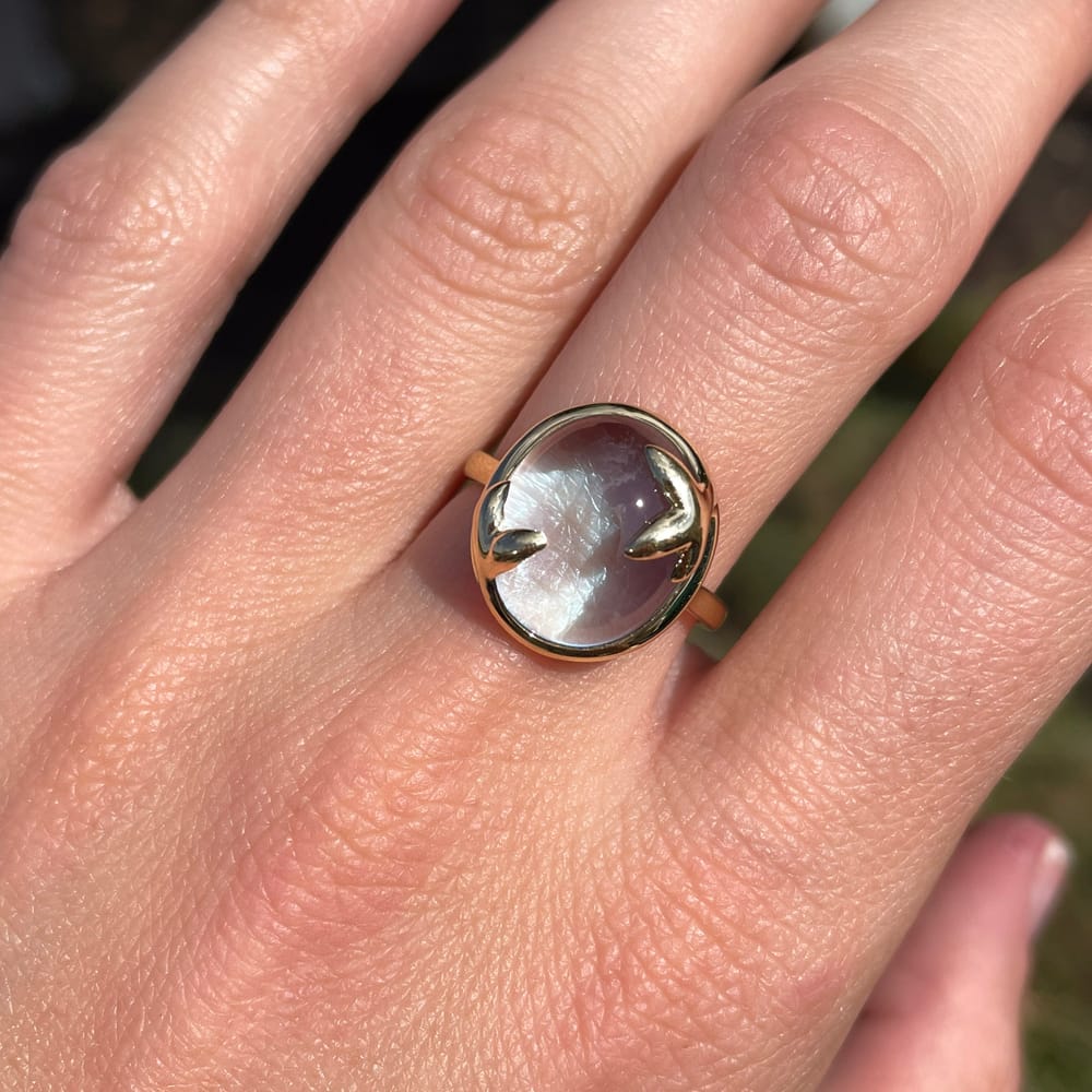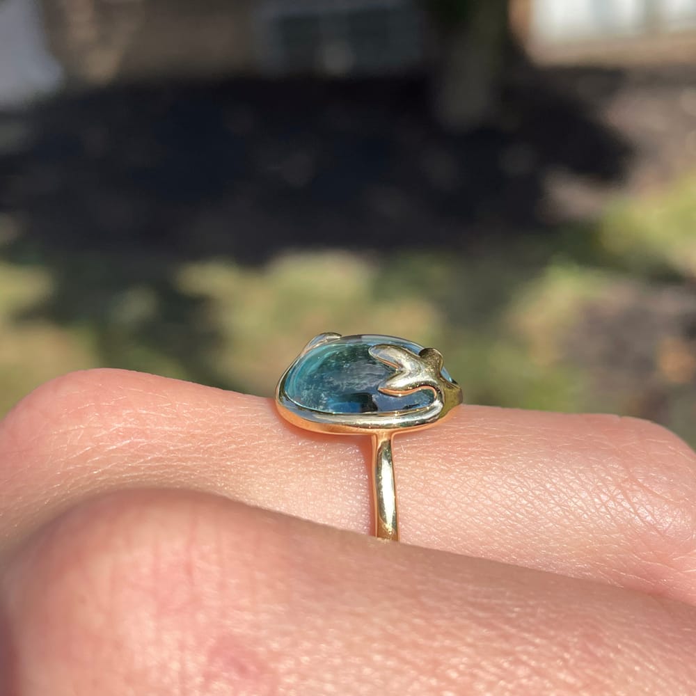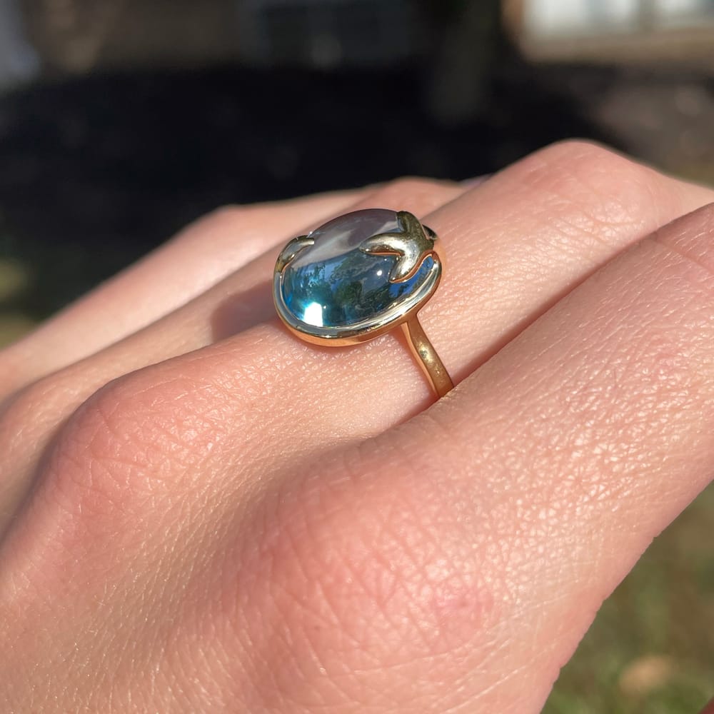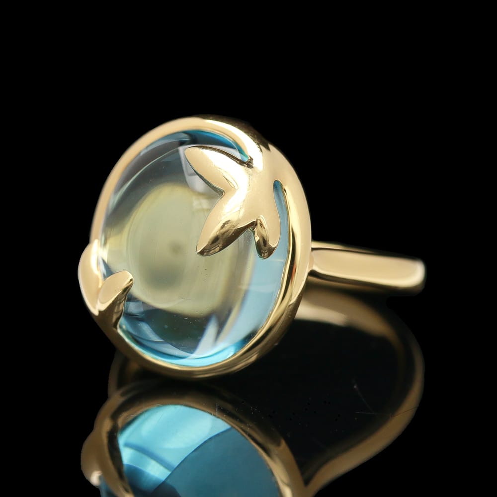 Designed by Paloma Picasso for Tiffany & Co., this Olive Leaf ring features a luminous blue topaz cabochon set in 18k gold. Paloma, daughter of one of the most influential artists of the 20th century, has been creating bold, colorful designs for Tiffany for over 30 years, with vibrant gemstones becoming her signature. The Olive Leaf collection draws inspiration from the olive groves surrounding her home in Morocco, with each piece celebrating nature’s beauty through gemstones as radiant as a summer sky.