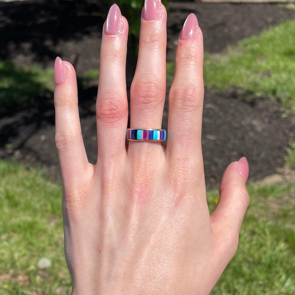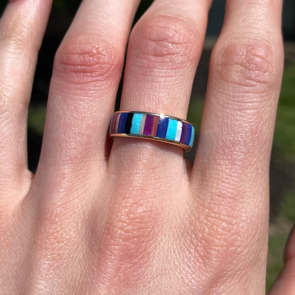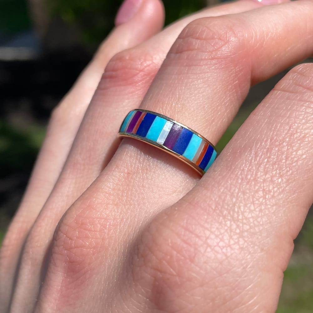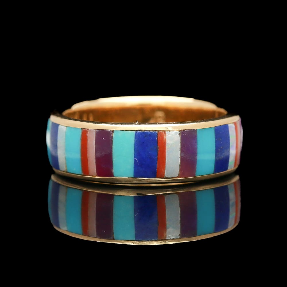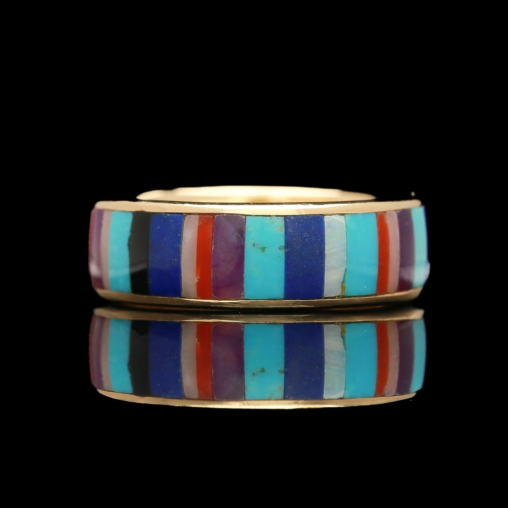 This exquisite Relios 14k yellow gold eternity band ring features a vibrant collection of inlaid gemstones: turquoise, coral, lapis lazuli, onyx, opal, shell, & sugilite, in rich robin’s egg blue, orangey-red, royal blue, black, shimmering white, light pink, and vibrant purple.