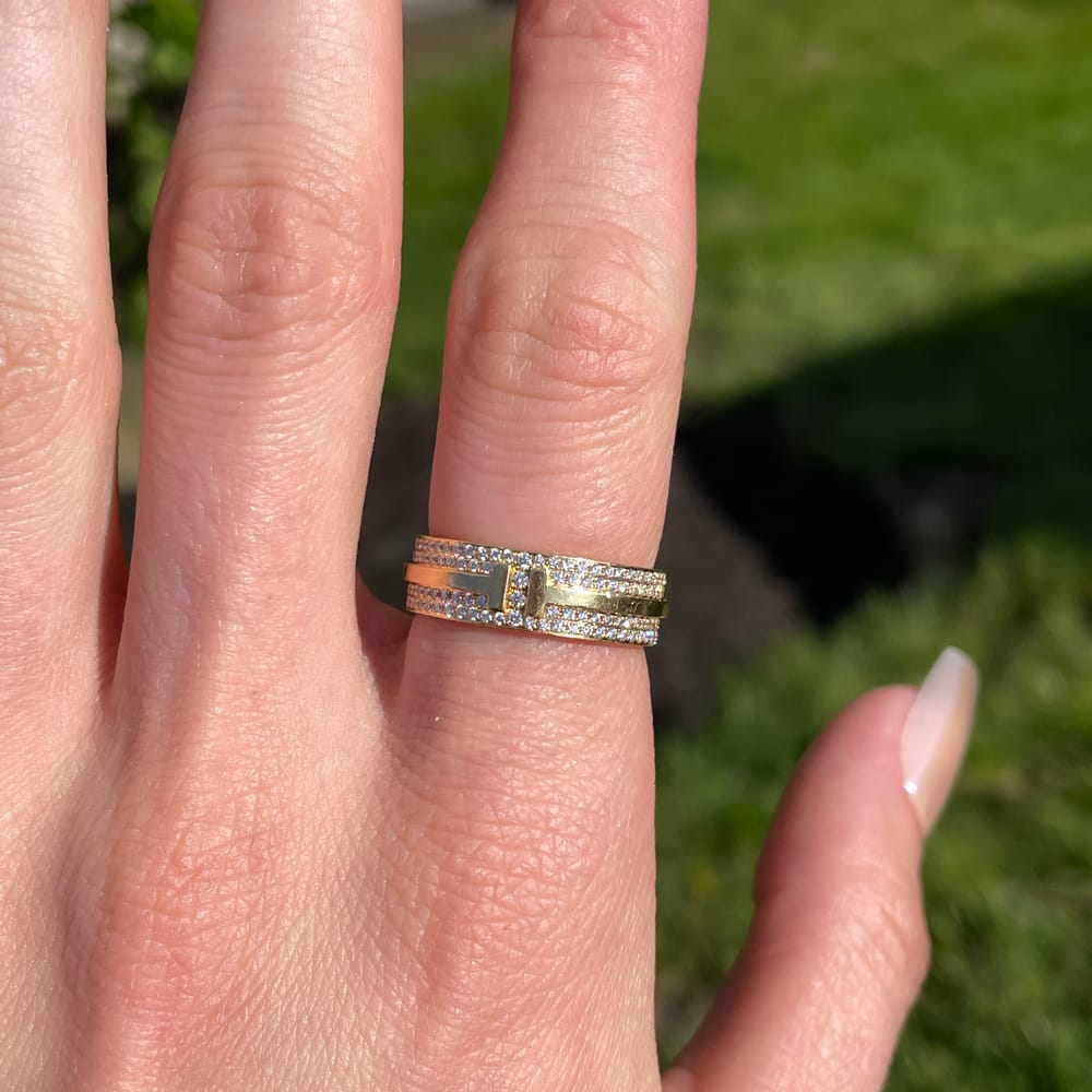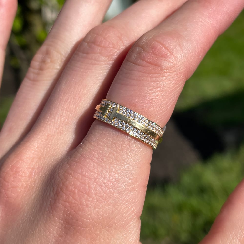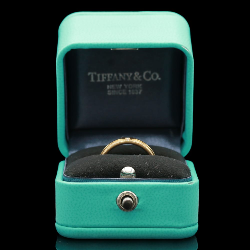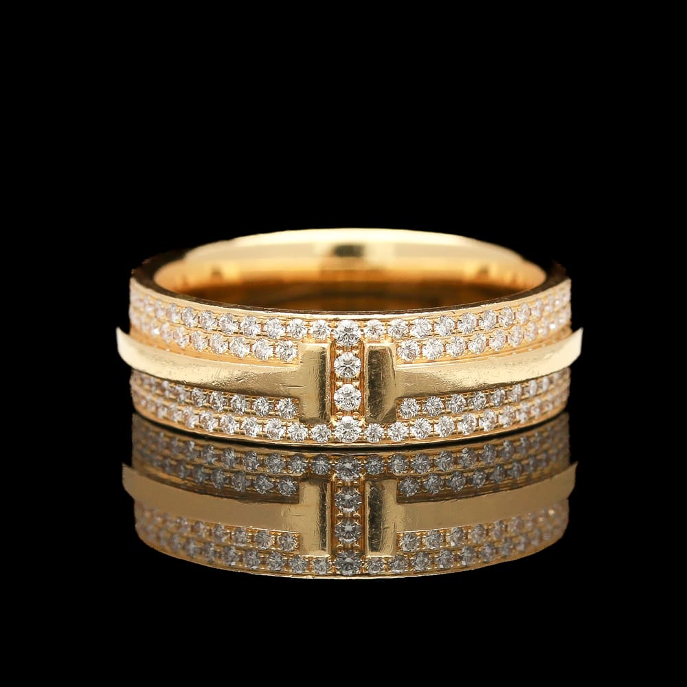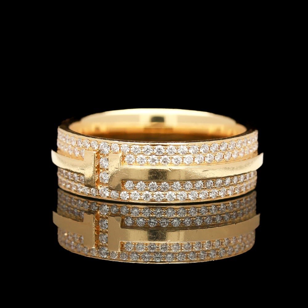 A Tiffany & Co. T ring crafted in 18K gold, the iconic motif inspired by an archival 1975 design and emblematic of the house’s enduring connection to New York’s spirit of possibility, featuring pavé-set diamonds totaling approximately 0.57 carats that lend continuous brilliance across the clean, architectural form, with a substantial 5.8 mm width that gives the piece a confident yet refined presence; a modern classic that balances symbolic design with understated luxury, embodying Tiffany’s legacy of innovation and timeless style. Comes with the original box.
