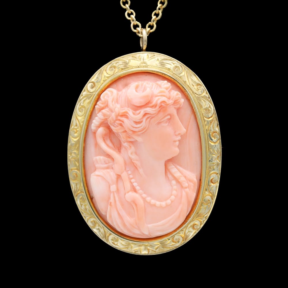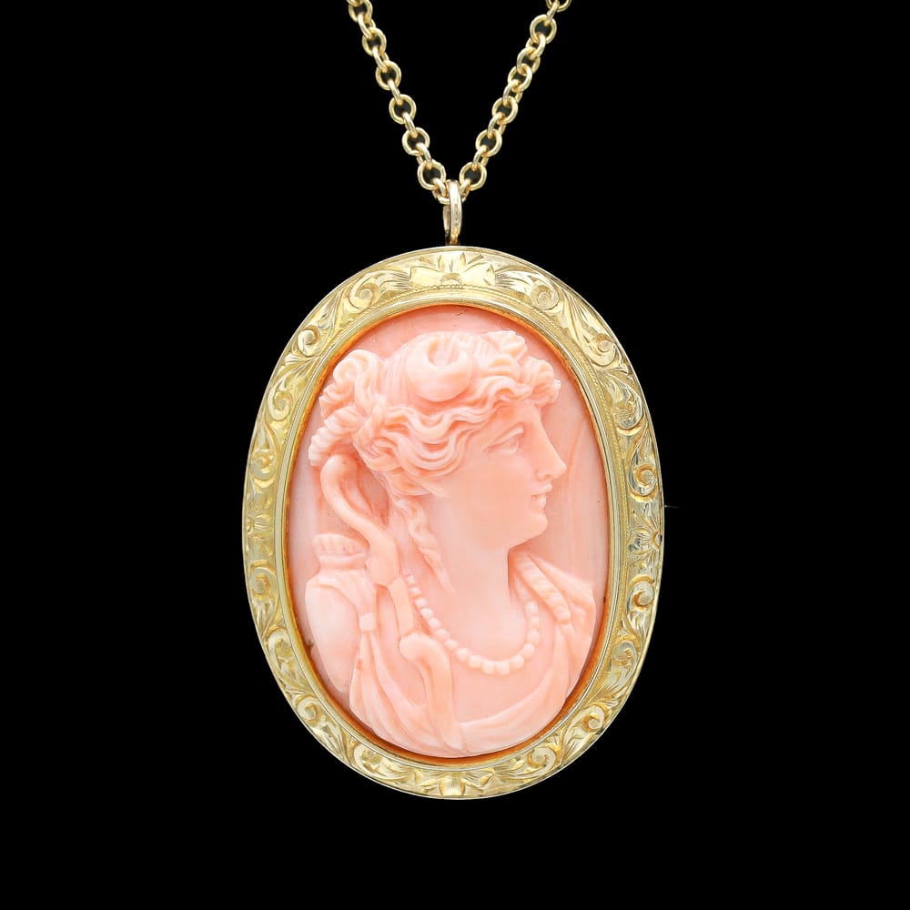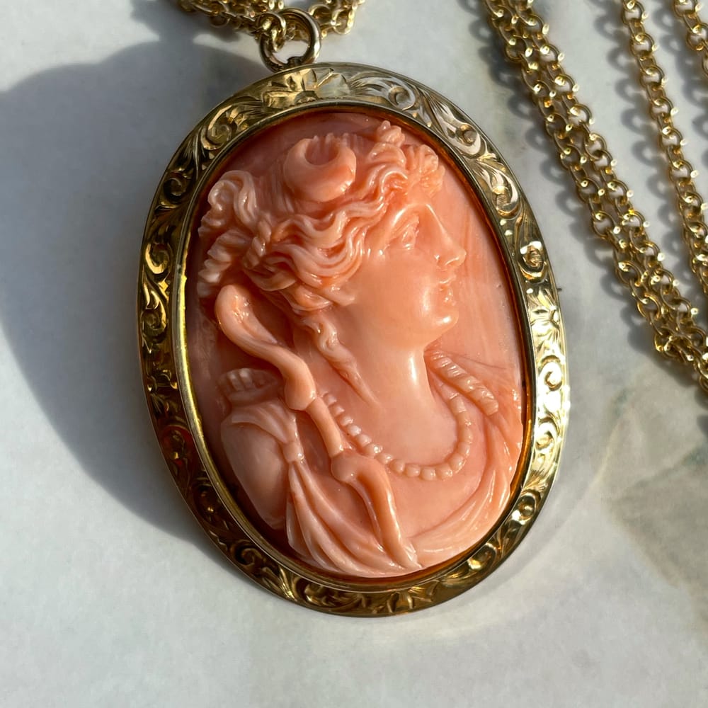 This exceptional Victorian-era necklace showcases a high-relief coral cameo, exquisitely hand-carved and set in richly engraved 10K and 14K yellow gold. The carving quality and craftsmanship are remarkable, especially given its age, and the piece remains in perfect antique condition.