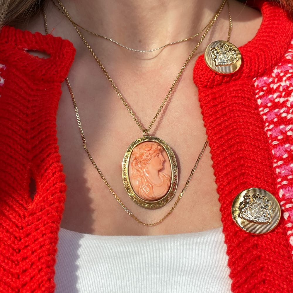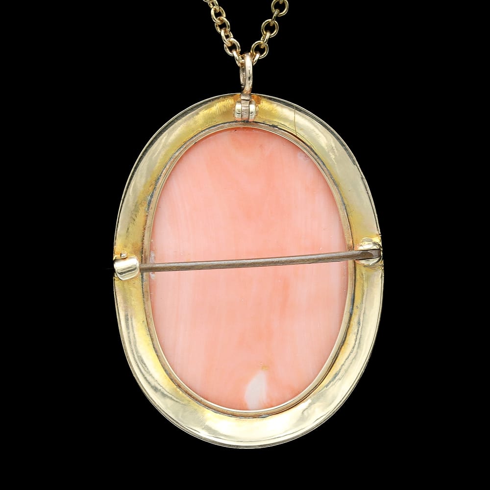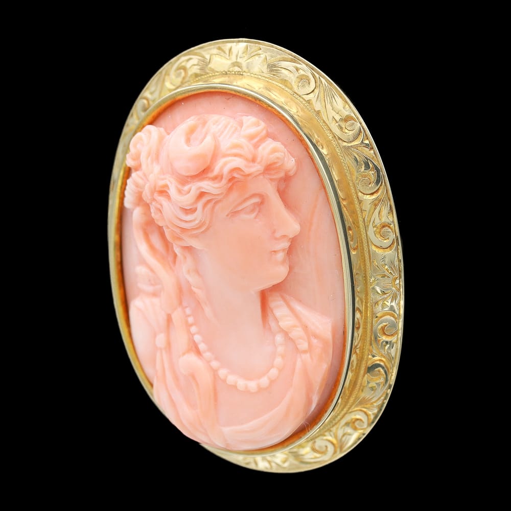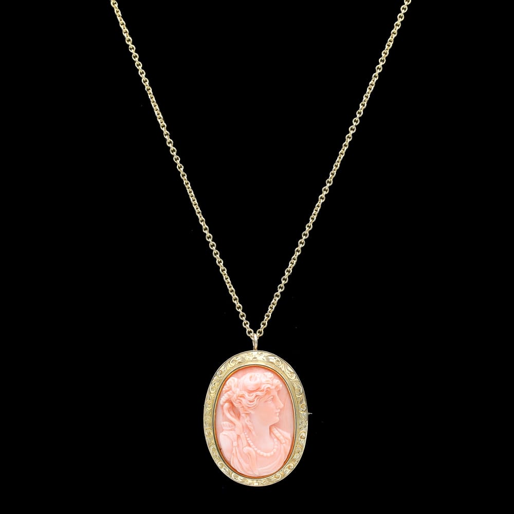 This exceptional Victorian-era necklace showcases a high-relief coral cameo, exquisitely hand-carved and set in richly engraved 10K and 14K yellow gold. The carving quality and craftsmanship are remarkable, especially given its age, and the piece remains in perfect antique condition.