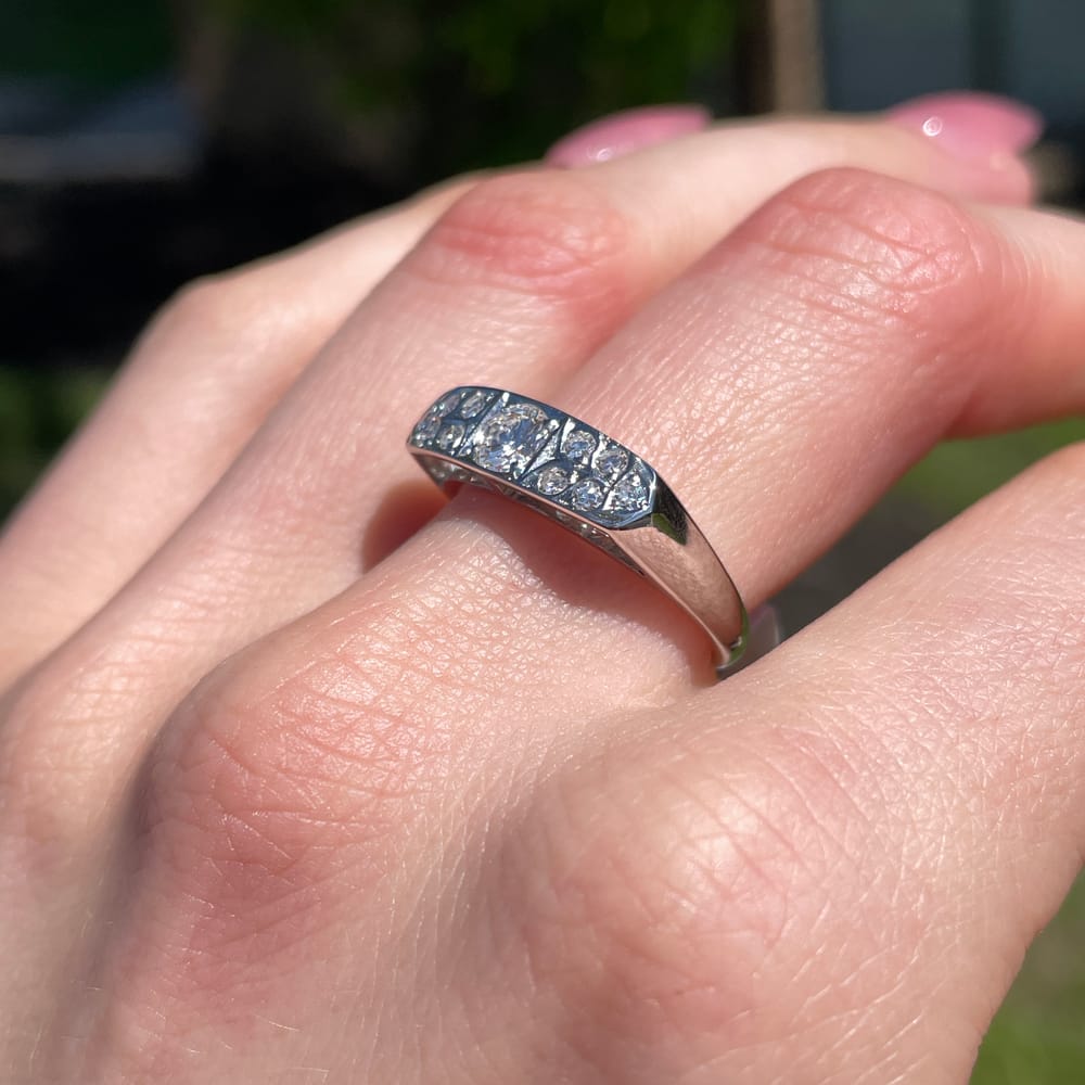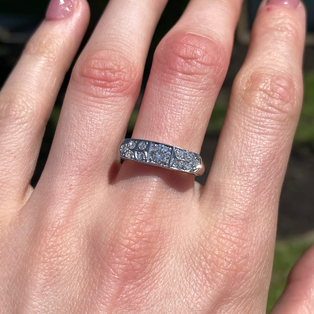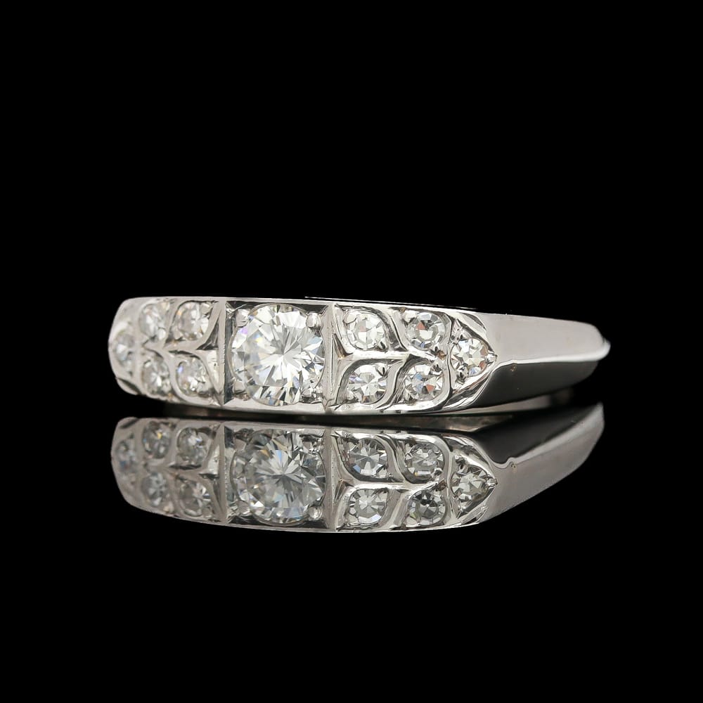 This exquisite vintage diamond ring features a 0.33 ct round natural diamond center stone, beautifully complemented by ten round single cut diamonds for a total carat weight of 0.51 ctw.