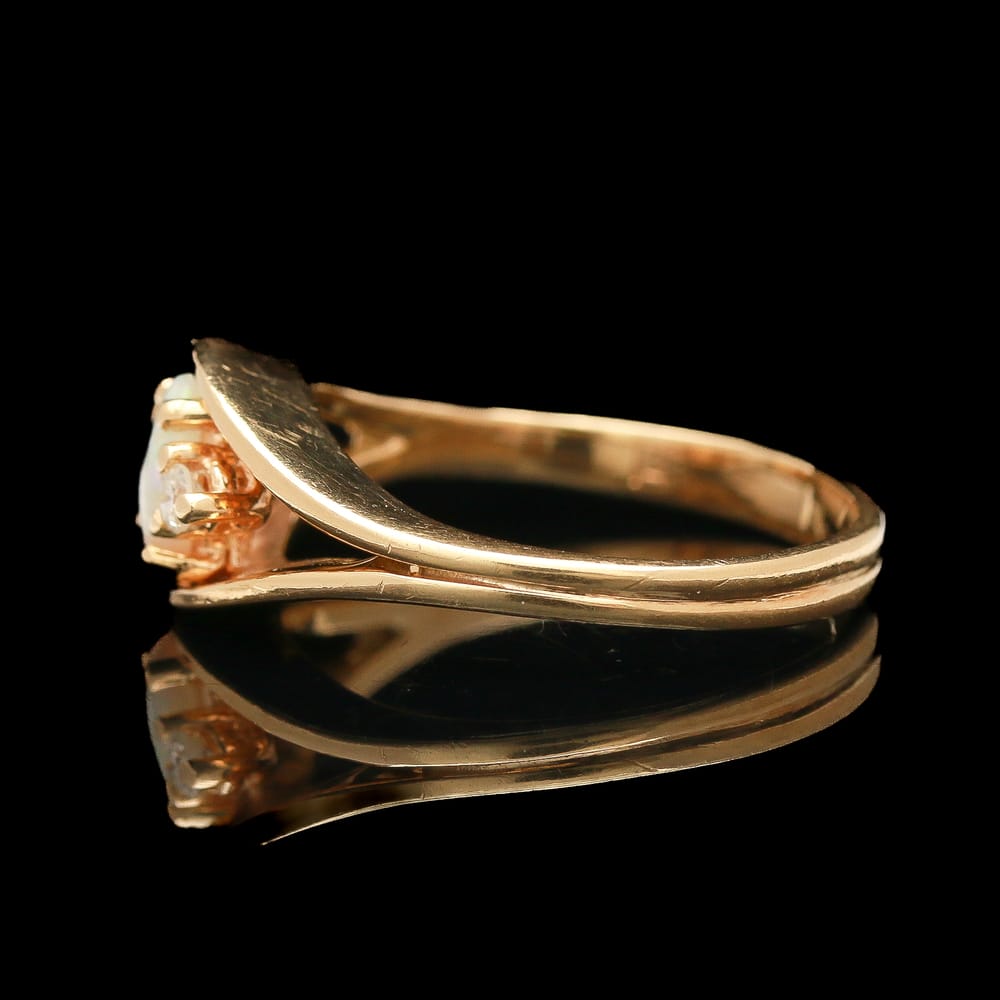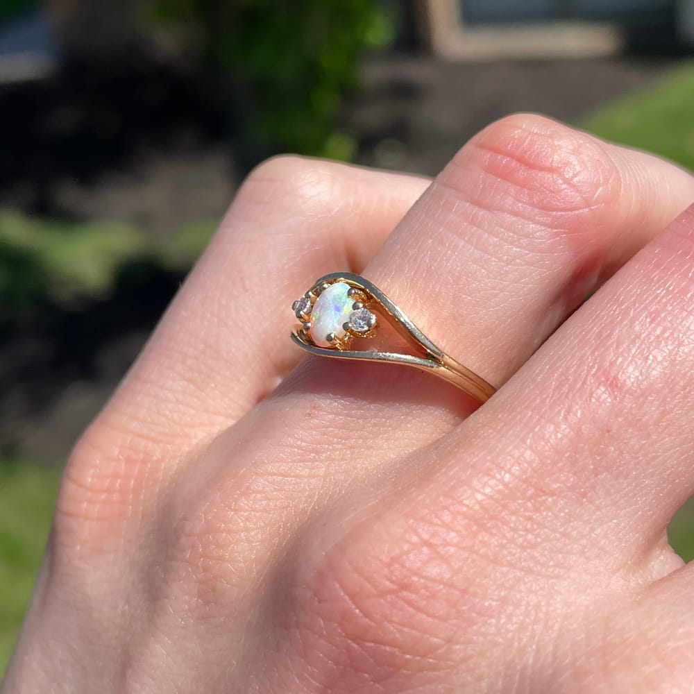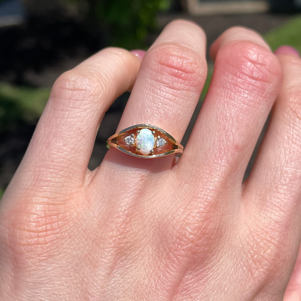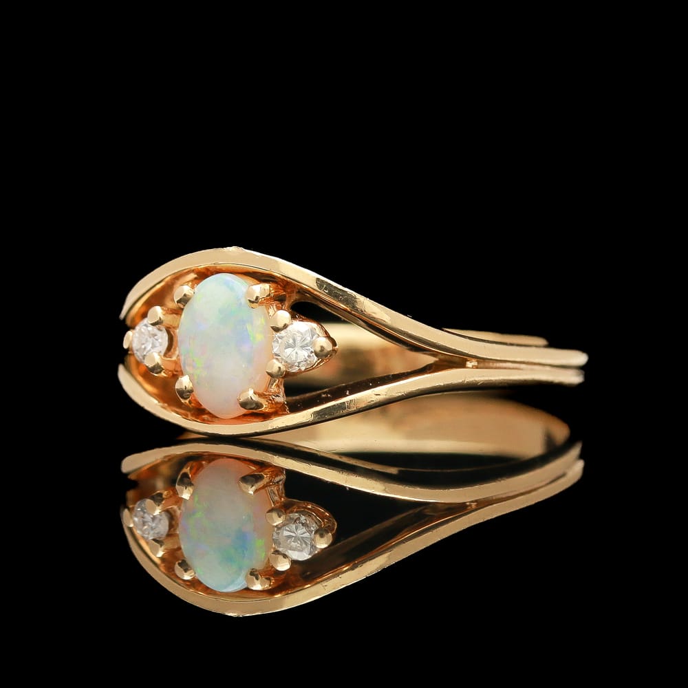 A charming vintage ring centered with a glowing opal cabochon, its surface alive with soft flashes of shifting color, flanked by two round diamonds that add a delicate accent of brilliance. Set in 14K yellow gold, the composition is simple and timeless, allowing the opal’s natural play-of-color to remain the focal point while the diamonds provide a subtle, classic balance.