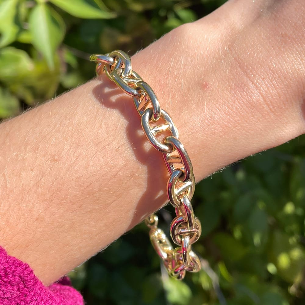 This exquisite semi hollow mariner link bracelet features 10.00 mm links crafted from polished 14K yellow gold, showcasing a sophisticated design perfect for any occasion.
