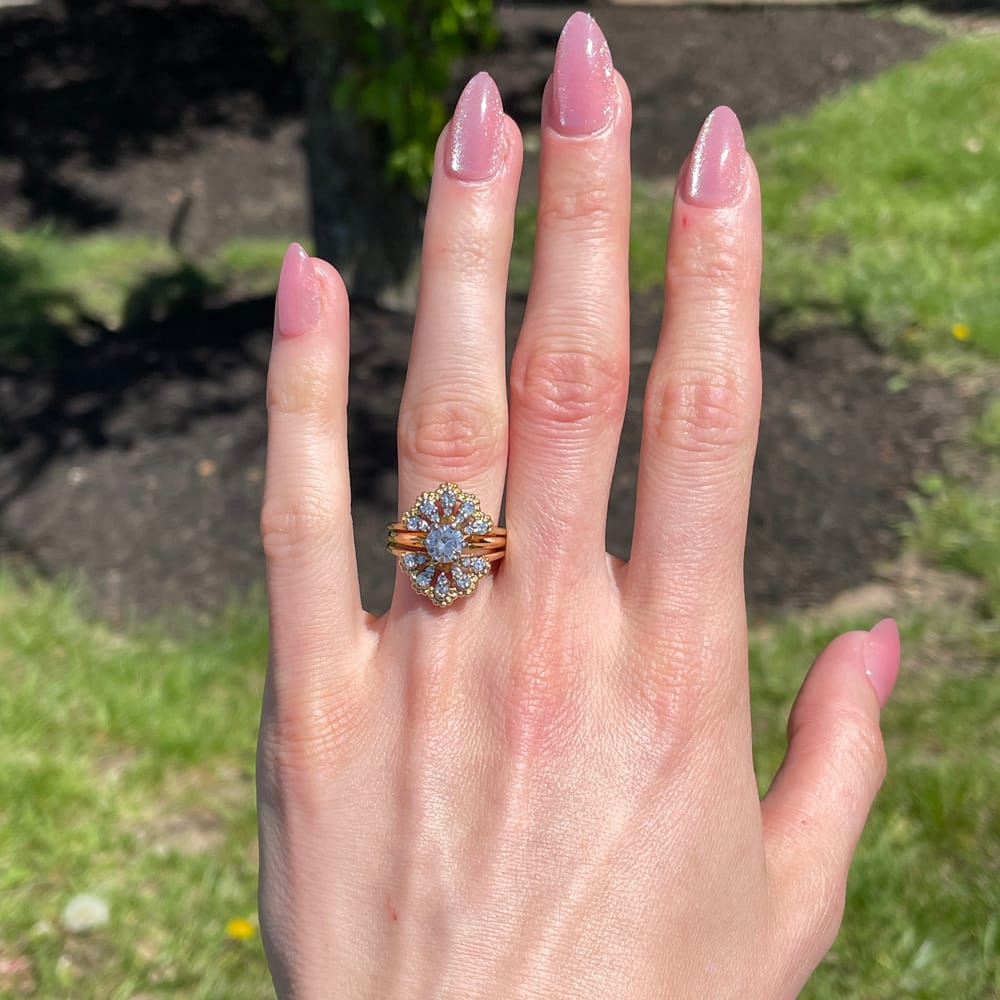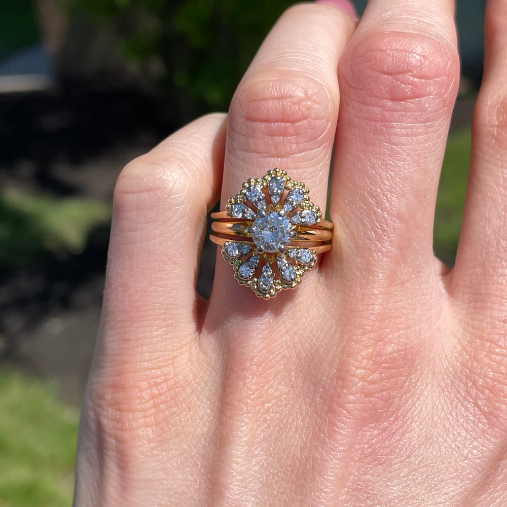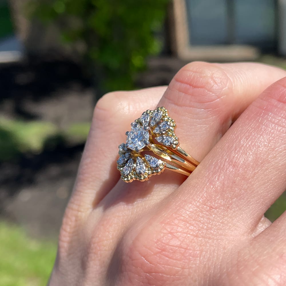 The rings are made of 18k yellow gold with 18k white gold settings. Each wedding band features a fan shape, which results in a gorgeous floral effect framing the center diamond. Please note that the three rings are soldered together as one ring.